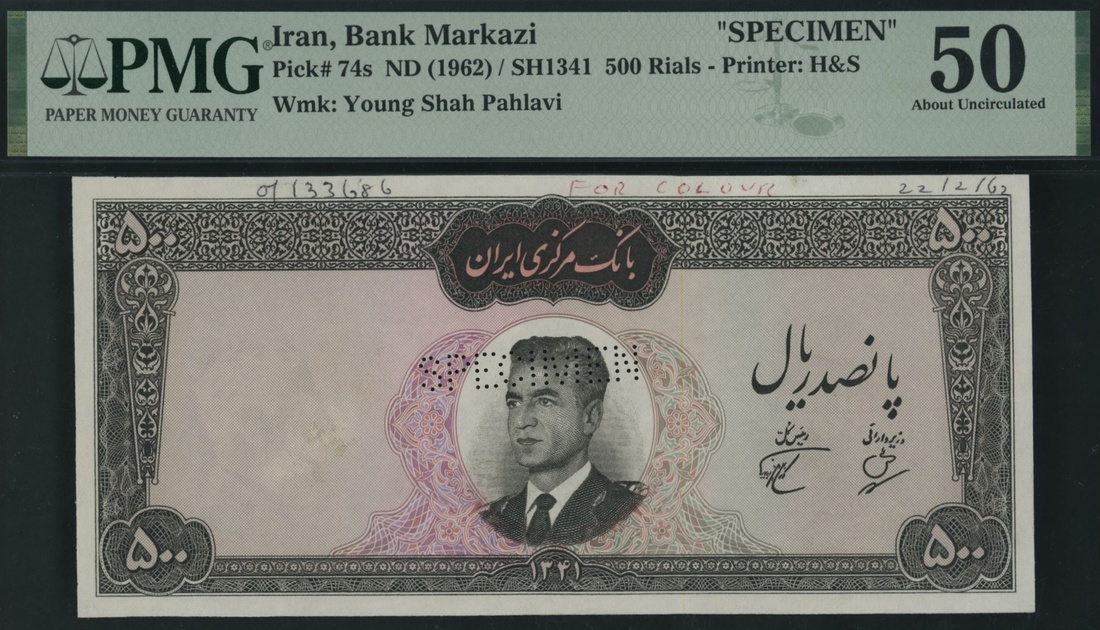 (x) Bank Markazi, Iran, specimen 500 Rials, ND (1962), no serial number, (Pick 74s, BNB 206 for type), in PMG holder 50 About Uncirculated, previously mounted, only 7 notes in higher grades at PMG