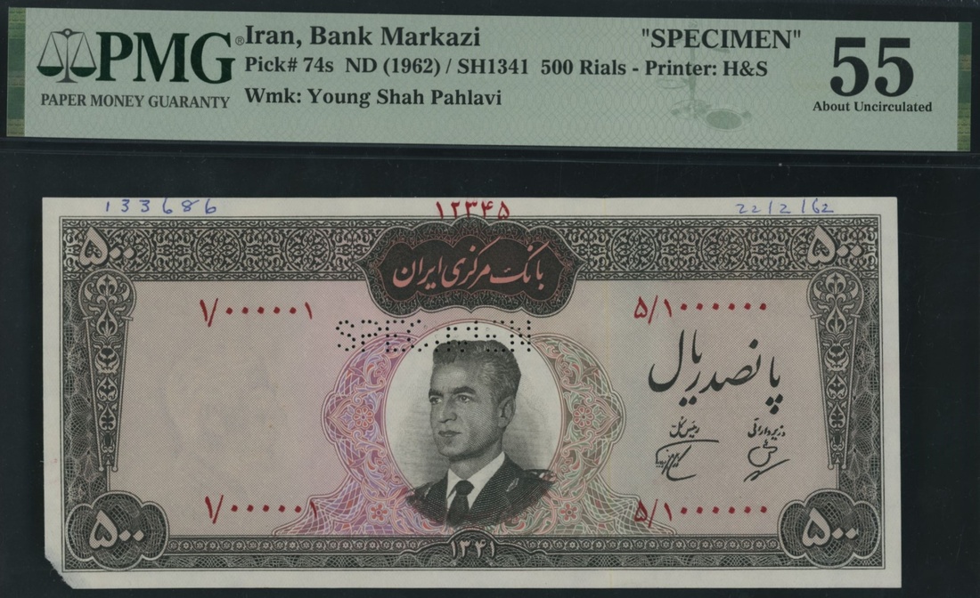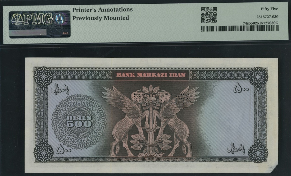 (x) Bank Markazi, Iran, specimen 500 Rials, ND (1962), serial number range 1/000001 - 5/1000000, (Pick 74s, BNB 206 for type), in PMG holder 55 About Uncirculated, printer´s annotations, previously mounted, only 6 notes in higher grades at PMG
