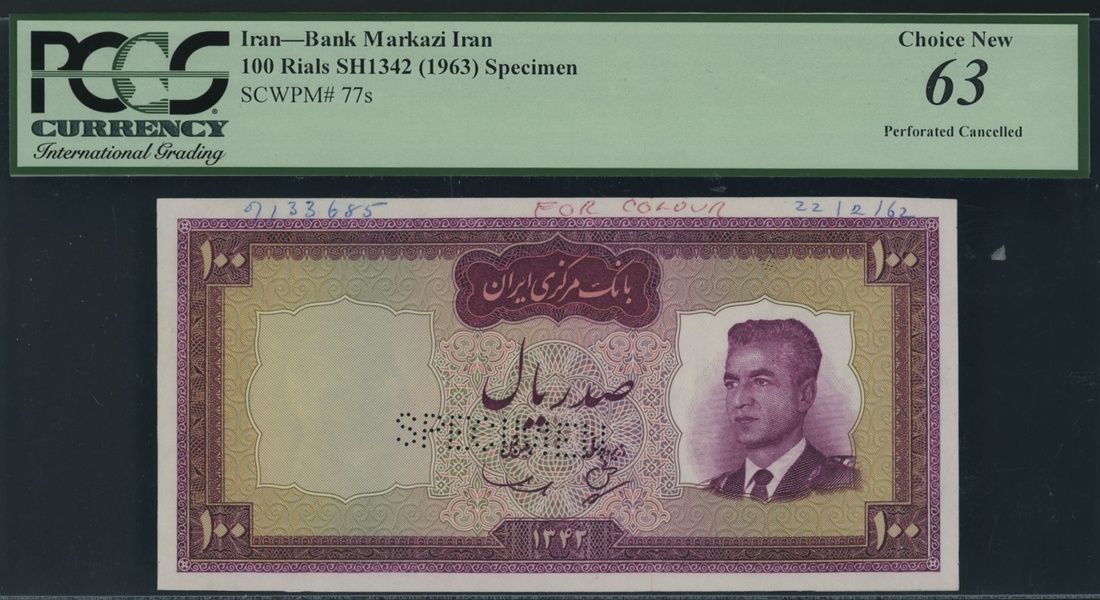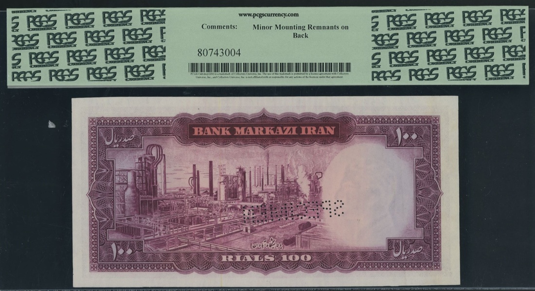 (x) Bank Markazi, Iran, specimen 100 Rials, 1963, no serial number, (Pick 77s, BNB 205), in PCGS holder 63 About New, perforated cancelled, minor mounting remnants on back