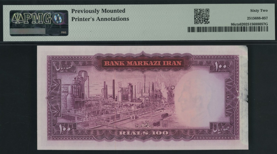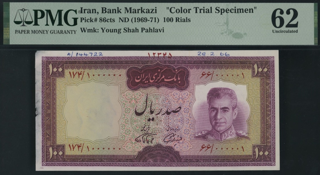 (x) Bank Markazi, Iran, colour trial specimen 100 Rials, ND (1969-71), serial number range 66/000001 - 174/1000000, (Pick 86cts, BNB 216), in PMG holder 62 Uncirculated, previously mounted, printer´s annotations, only 1 note in higher grade at PMG