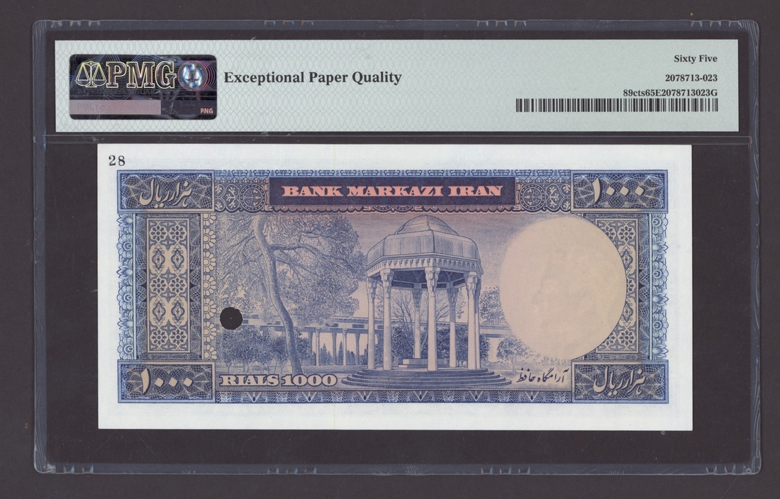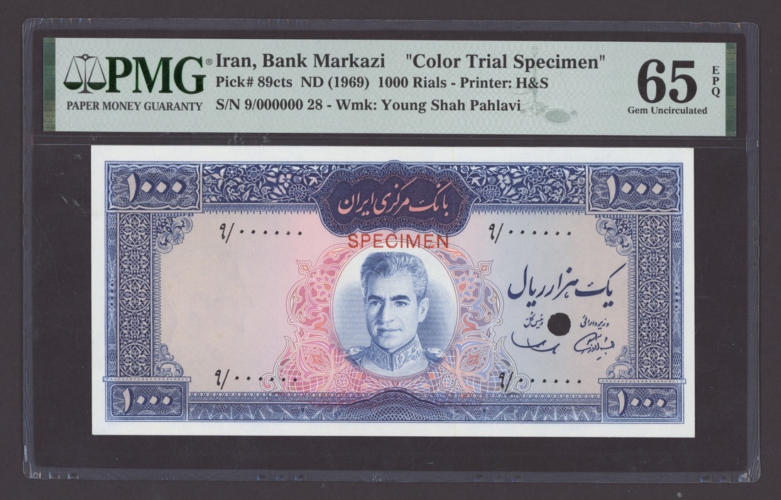 (x) Bank Markazi, Iran, colour trial specimen 1000 Rials, ND (1969), serial number 9/000000 28, (Pick 89cts, BNB 219), in PMG holder 65 EPQ Gem Uncirculated, only 3 notes in higher grades at PMG