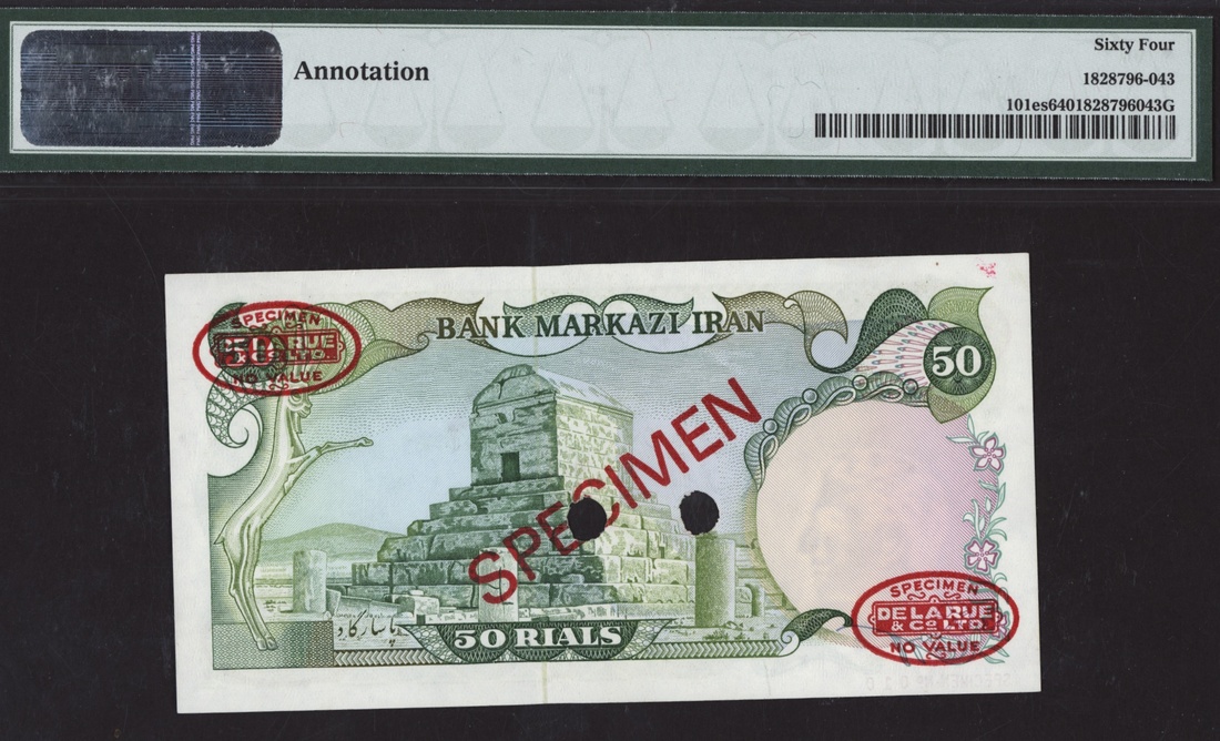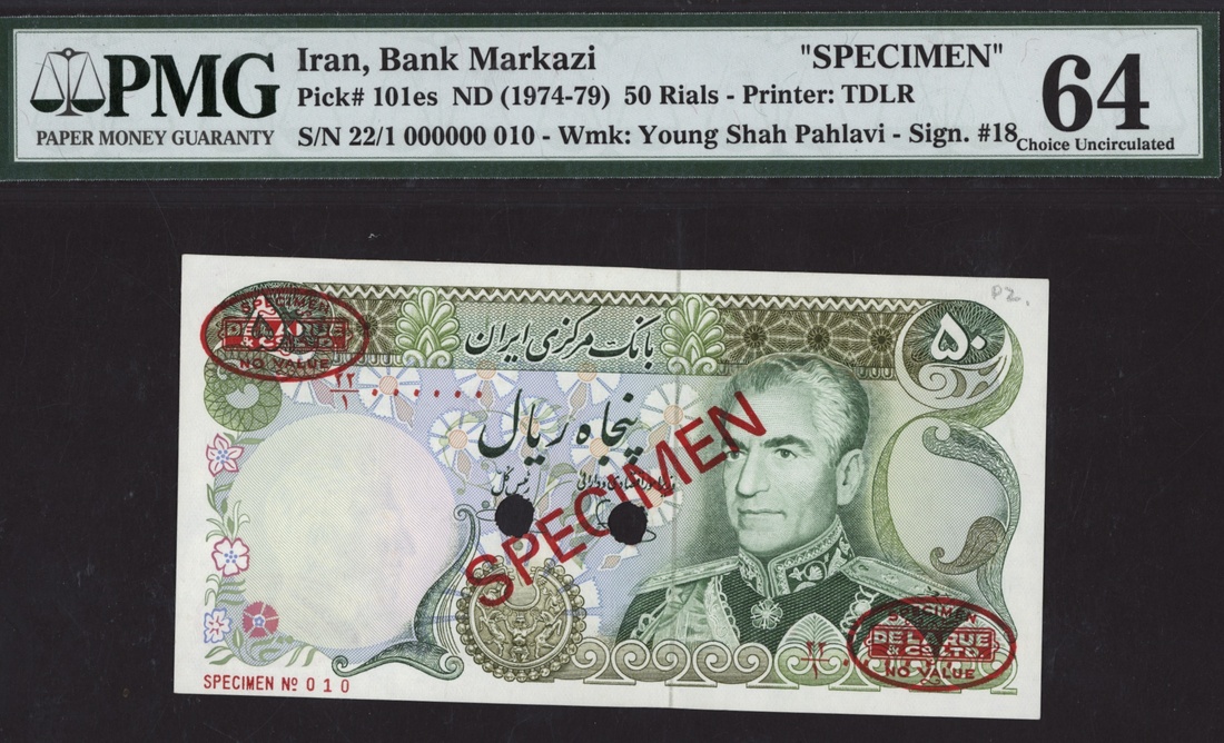 Bank Markazi, Iran, specimen 50 Rials, ND (1974), serial number 22/1 000000, specimen number 010, (Pick 101es, BNB 231 es), in PMG holder 64 Choice Uncirculated, annotation