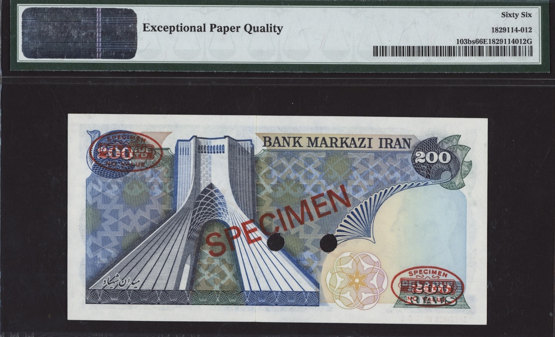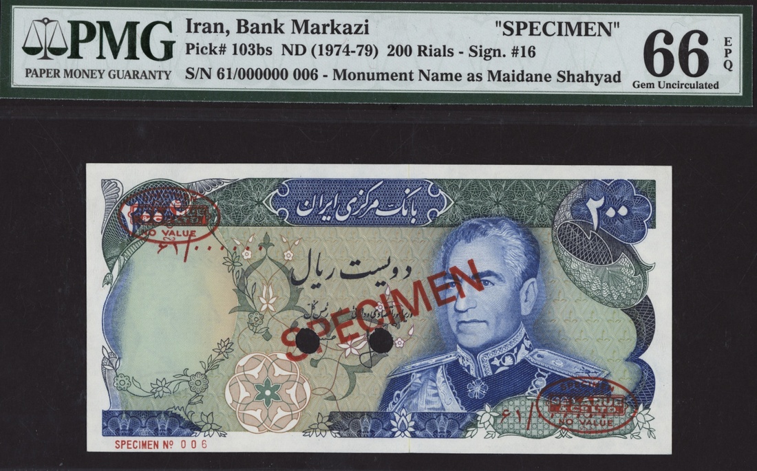 Bank Markazi, Iran, specimen 200 Rials, ND (1974), serial number 61/000000, specimen number 006, (Pick 103bs, BNB 234a), in PMG holder 66 EPQ Gem Uncirculated