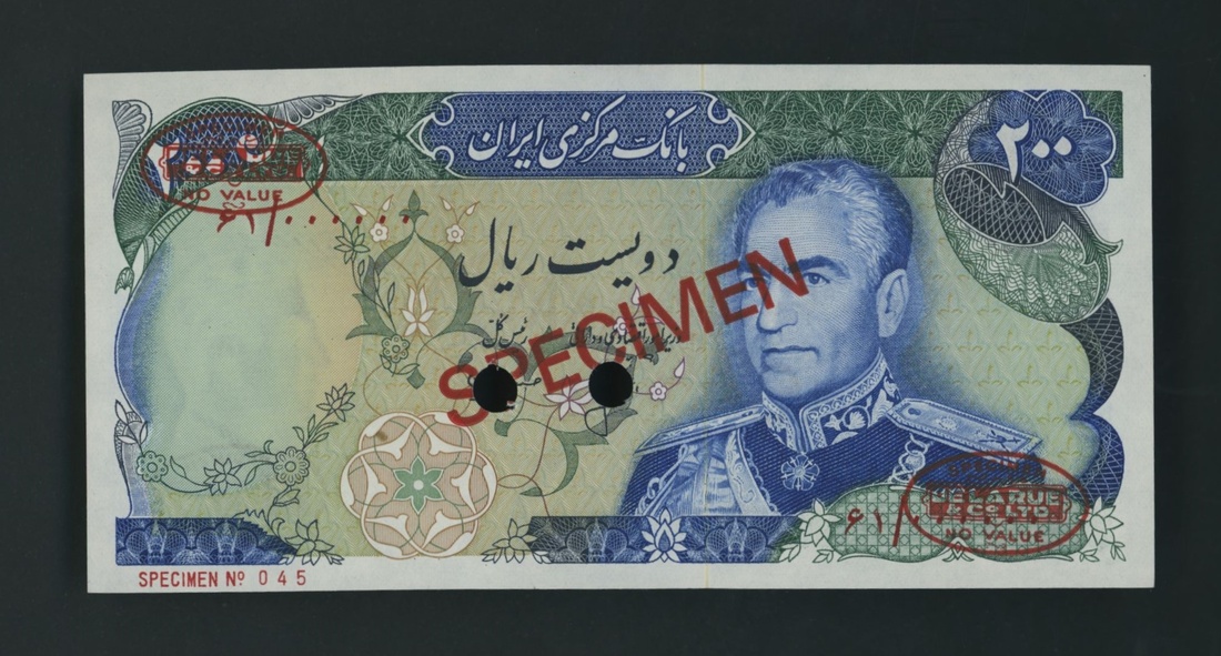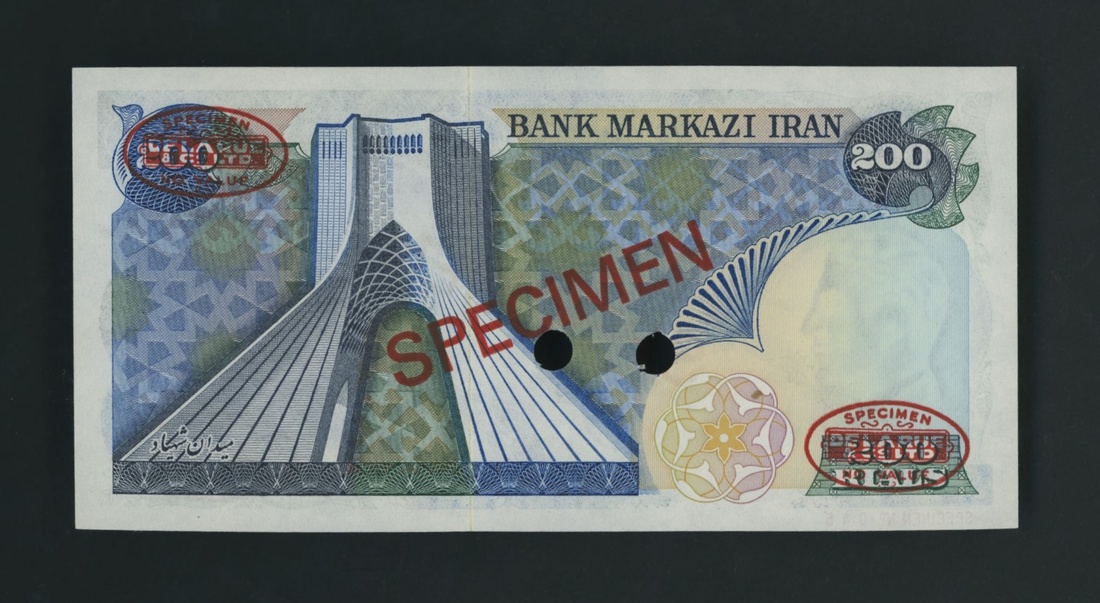 (x) Bank Markazi, Iran, specimen 200 Rials, ND (1974-79), serial number 91/000000 045, 12 point star in design on back, yellow security thread, monument name as Maidane Shahyad, signature 16