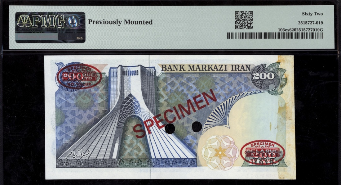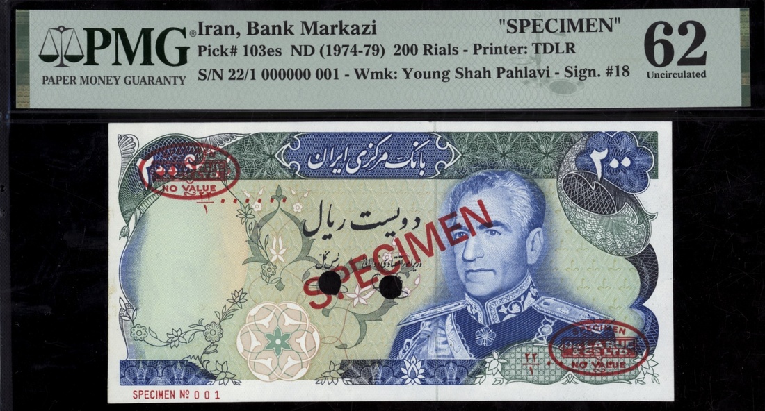 (x) Bank Markazi, Iran, specimen 200 Rials, ND (1974-79), serial number 22/1 000000 001, (Pick 103es, BNB 234), in PMG holder 62 Uncirculated, previously mounted