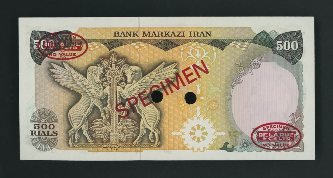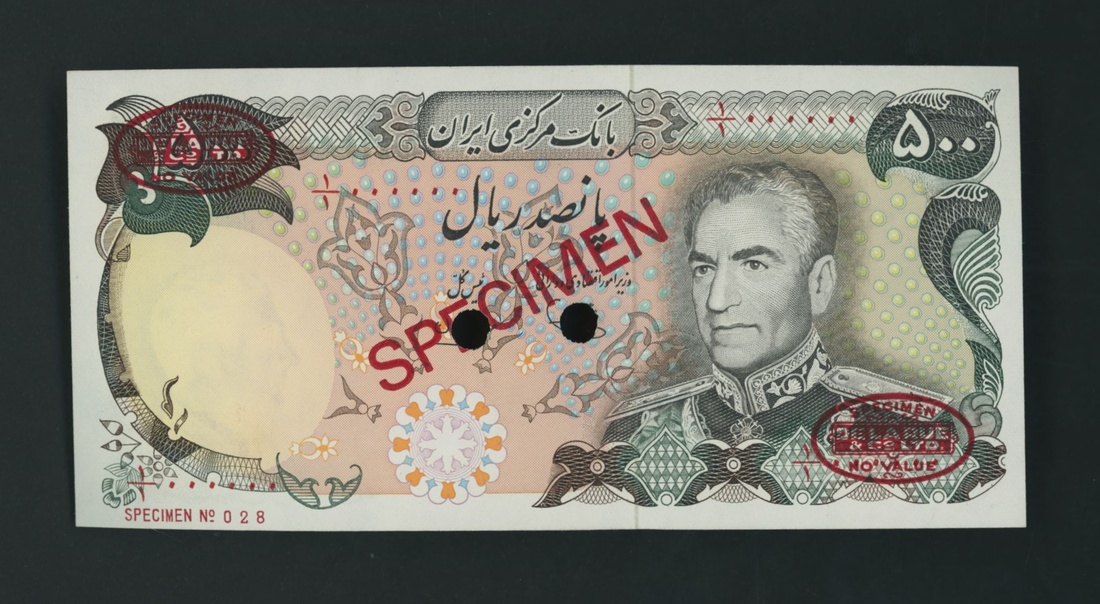 (x) Bank Markazi, Iran, specimen 500 Rials, ND (1974-79), serial number 1/1 000000 028, (Pick 104cs, BNB 236s), uncirculated