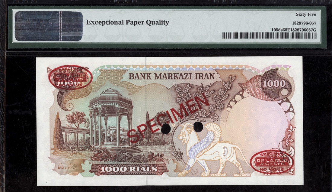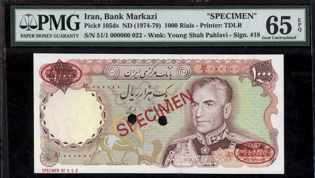 (x) Bank Markazi, Iran, specimen 1000 Rials, ND (1974-79), serial number 51/1 000000 022, (Pick 105ds, BNB 237), in PMG holder 65 EPQ Gem Uncirculated