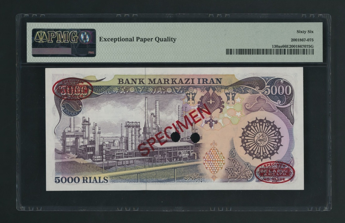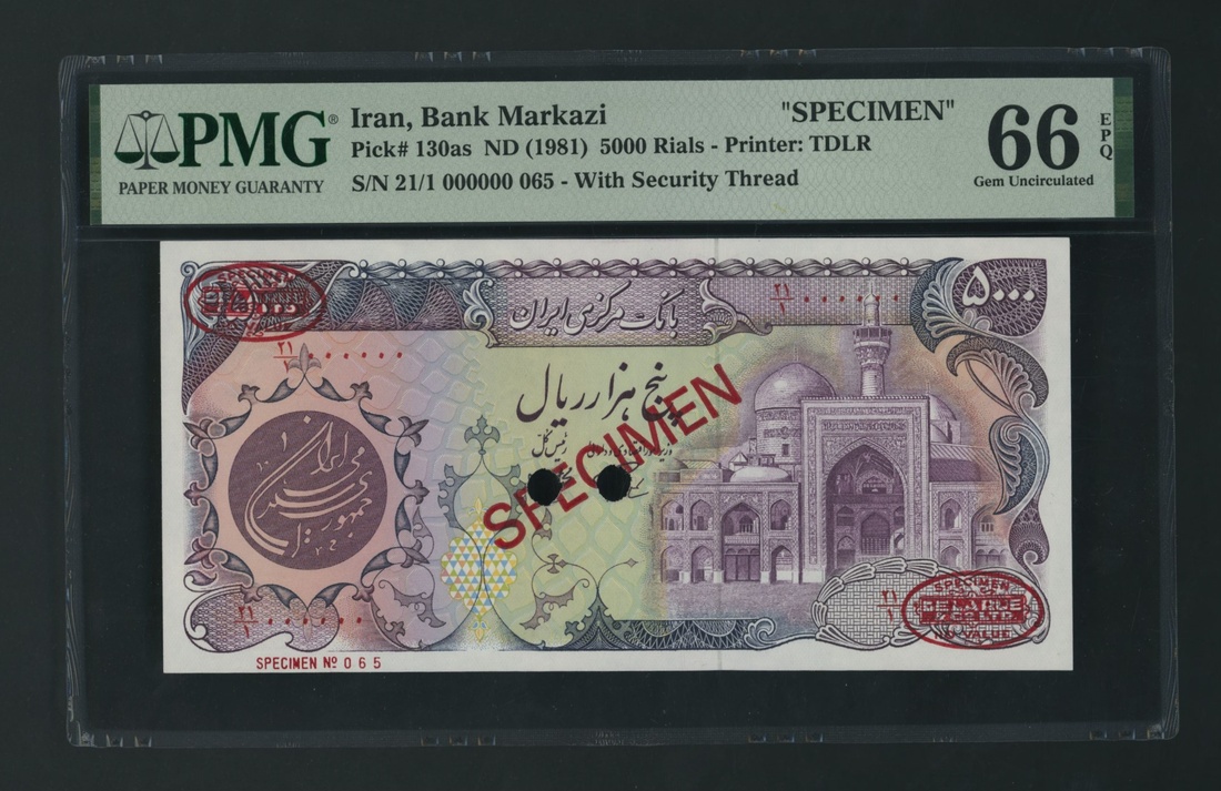 (x) Bank Markazi, Iran, specimen 5000 Rials, ND (1981), serial number 21/1 000000 065, (Pick 130as, BNB 265s), in PMG holder 66 EPQ Gem Uncirculated, only 5 notes in higher grades at PMG