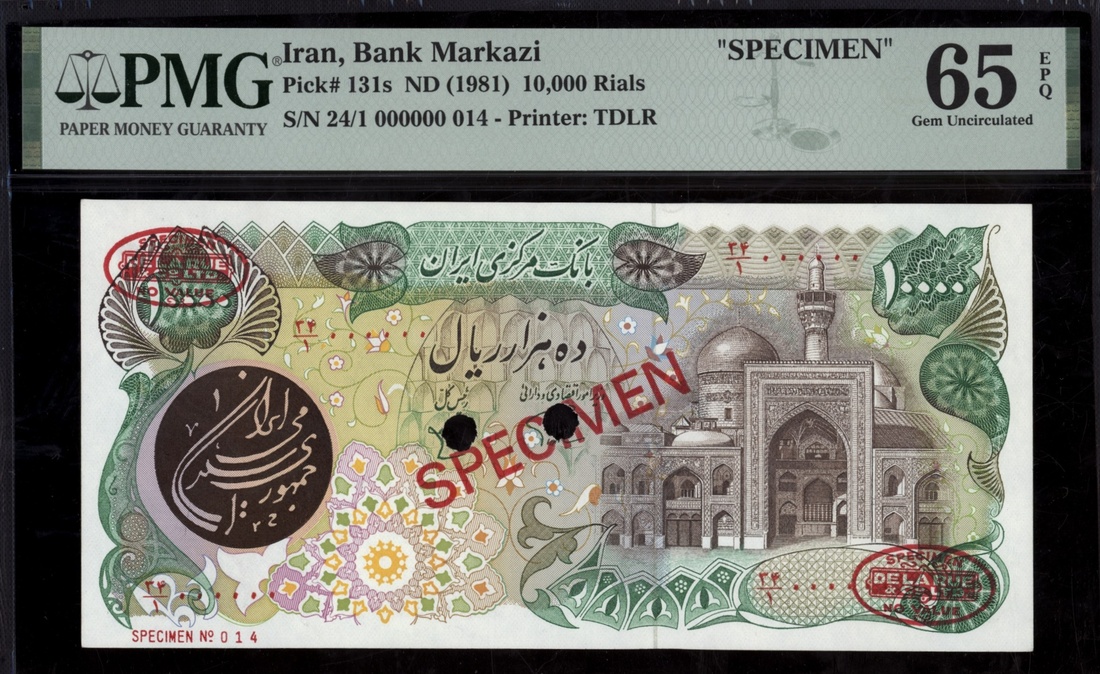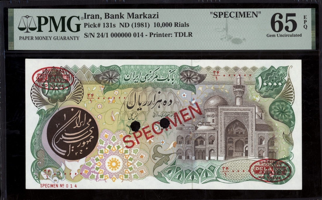 (x) Bank Markazi, Iran, specimen 10.000 Rials, ND (1981), serial number 24/1 000000 014, (Pick 131s, BNB 266), in PMG holder 65 EPQ Gem Uncirculated