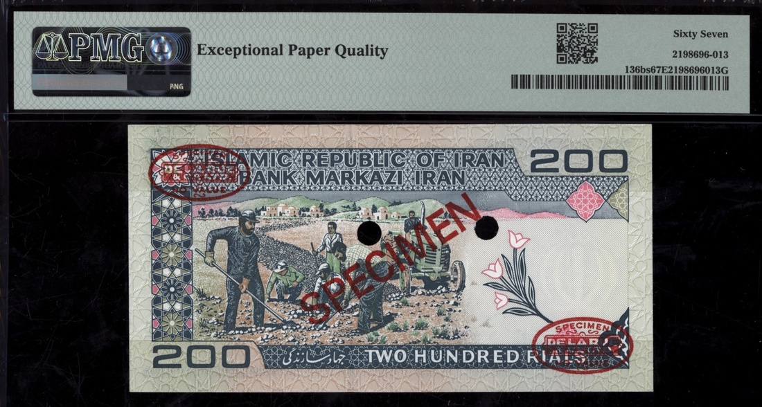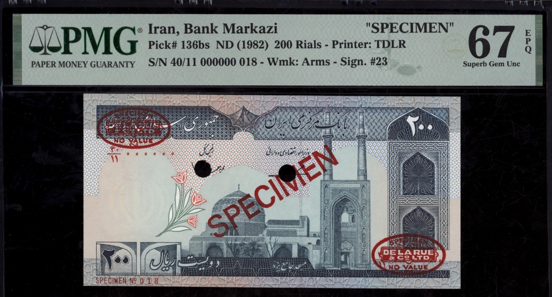 (x) Bank Markazi, Iran, [Top Pop] specimen 200 Rials, ND (1982), serial number 40/11 000000 018, (Pick 136bs, BNB 268), in PMG holder 67 EPQ Superb Gem Uncirculated, single finest graded at PMG