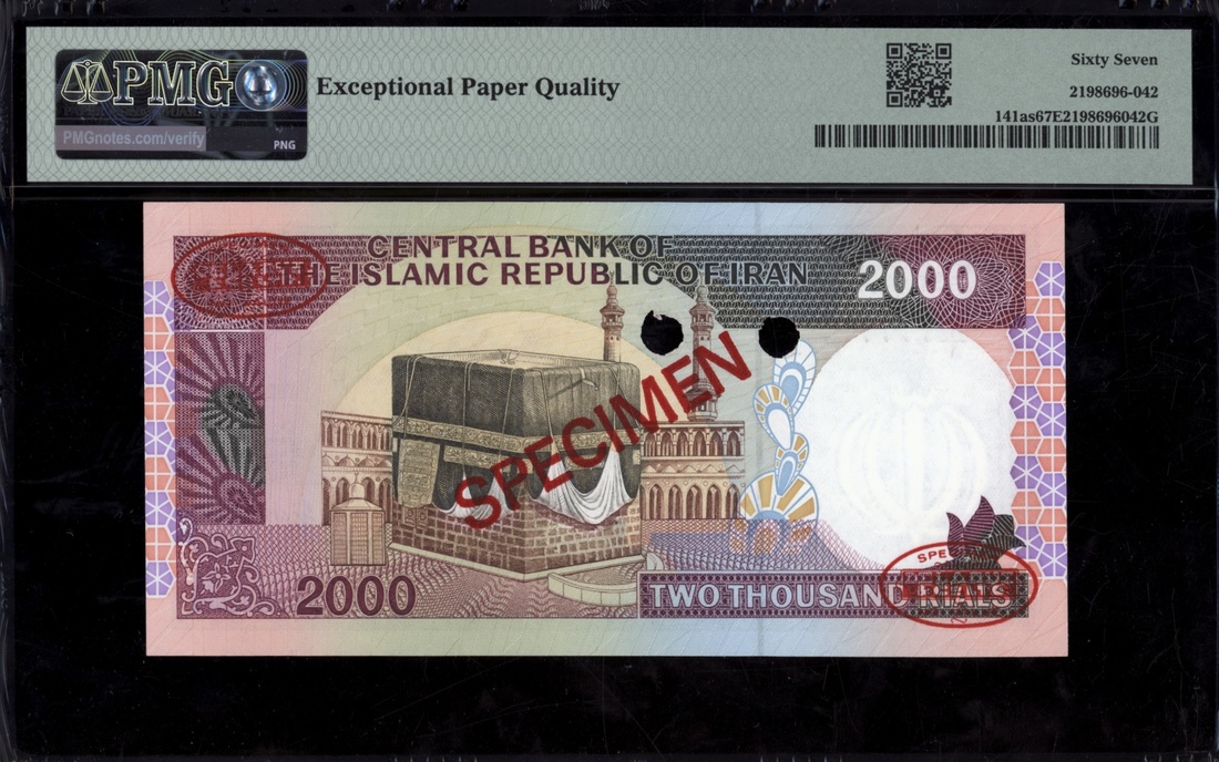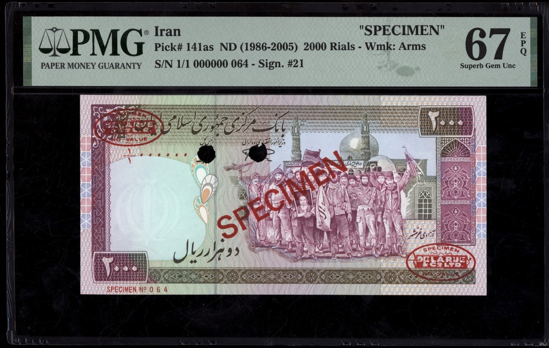 (x) Central Bank, Iran, specimen 2000 Rials, ND (1986-2005), serial number 1/1 000000 064, (Pick 141as, BNB 277), in PMG holder 67 EPQ Superb Gem Uncirculated, only 2 notes in higher grades at PMG