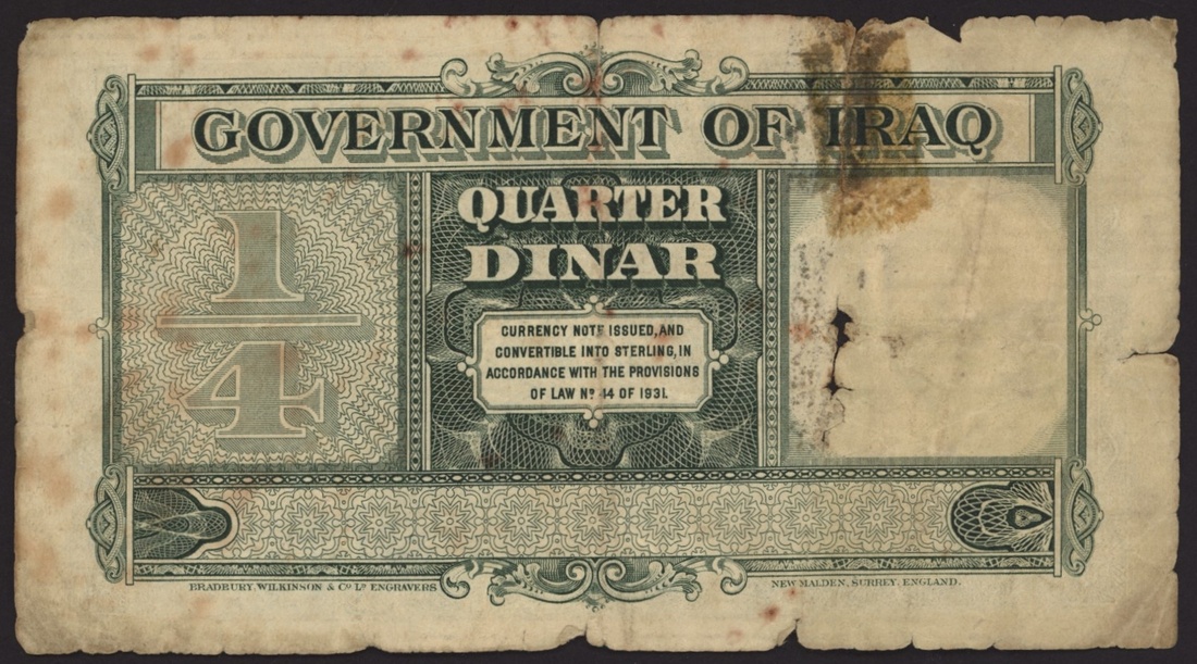 Government of Iraq, 1/4 Dinar, 1931, serial number H325725, (Pick 16a, BNB 118a), solid fair, split and small missing piece along the left side fold, margin wear and tear