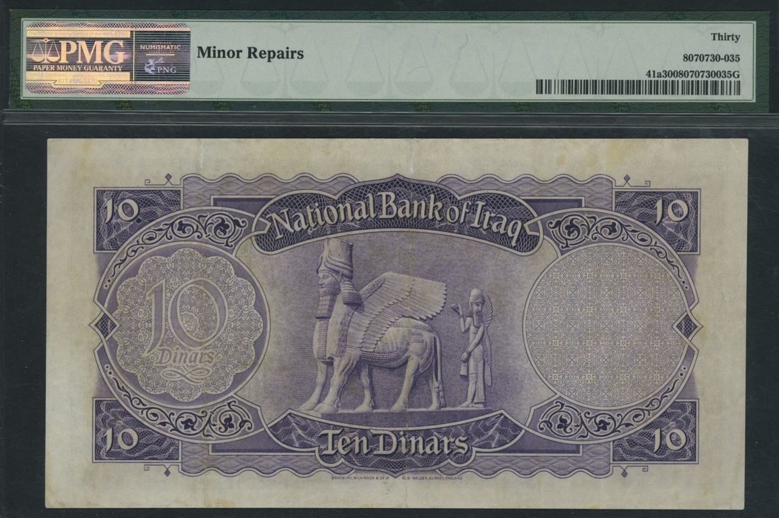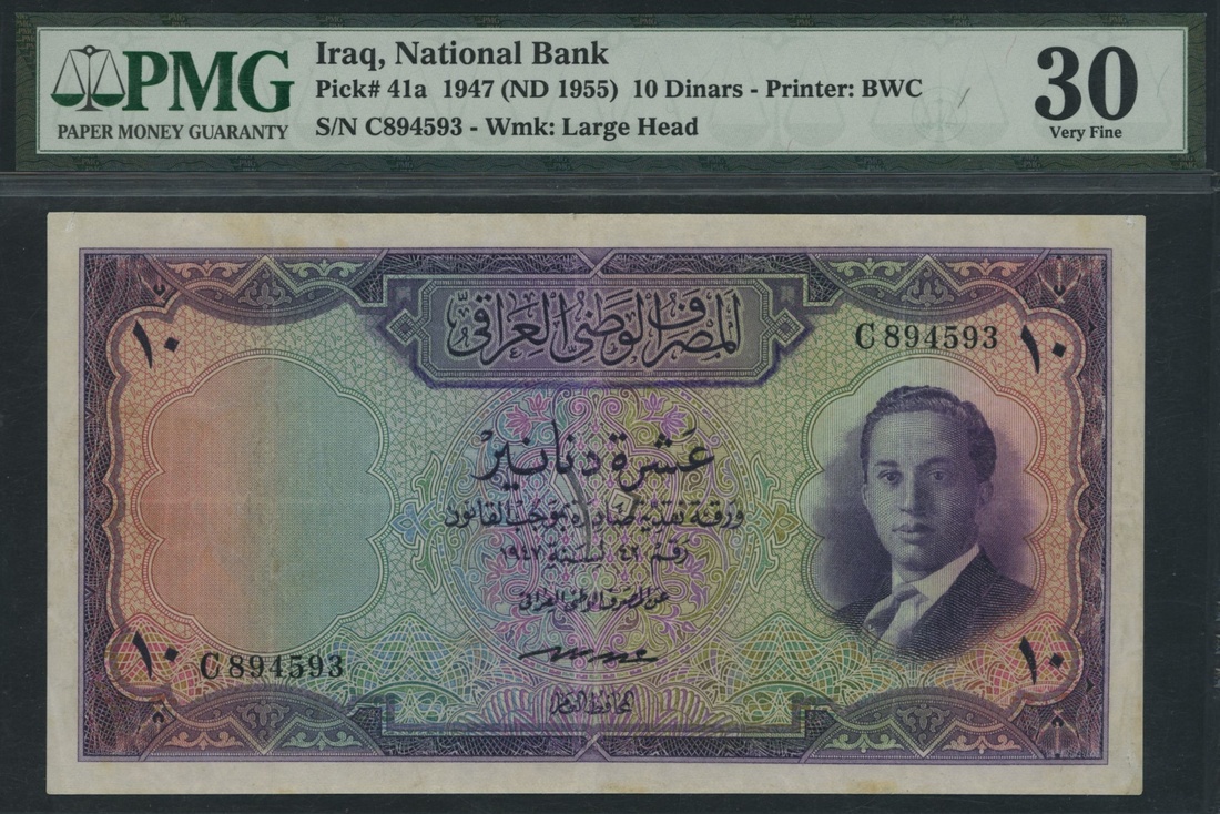 (x) National Bank of Iraq, 10 Dinars, 1947 (ND 1955), serial number C894593, (Pick 41a, BNB 215), in PMG holder 30 Very Fine, minor repairs