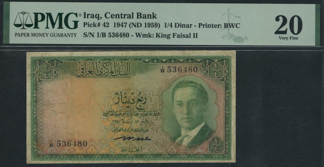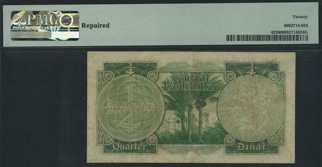 (x) Central Bank of Iraq, 1/4 Dinar, 1947 (ND 1959), serial number 1/B 536480, (Pick 42, BNB 301), in PMG holder 20 Very Fine, repaired