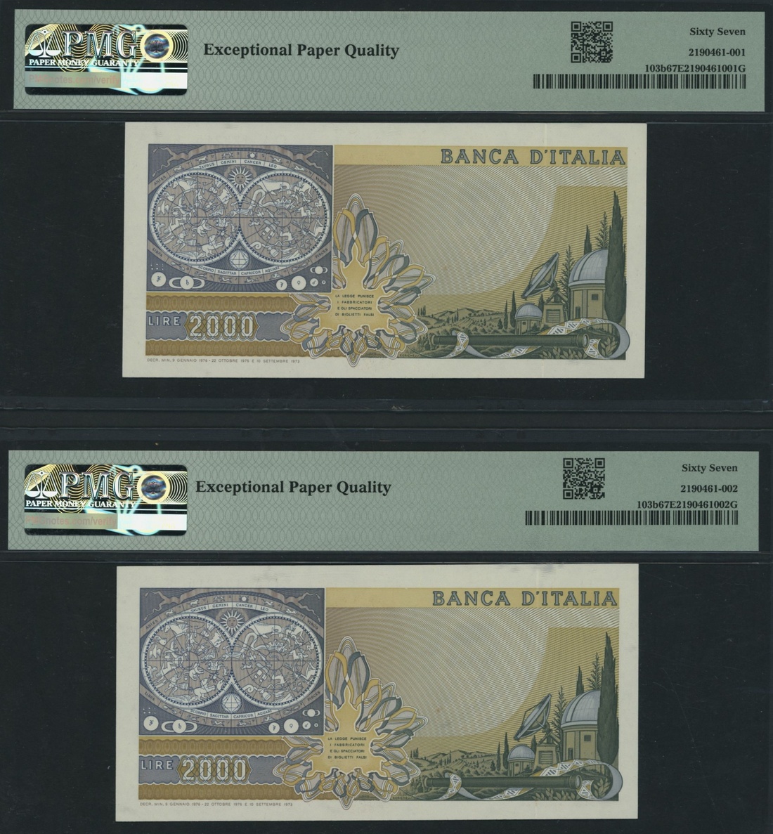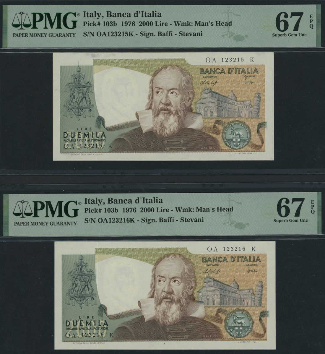 (x) Banca d'Italia, Italy, pair of 2000 Lire, 1976, consecutive serial number OA123215-16K, (Pick 103b, BNB 453), in PMG holder 67 EPQ Superb Gem Uncirculated (2 notes), with only 1 note in higher grade at PMG