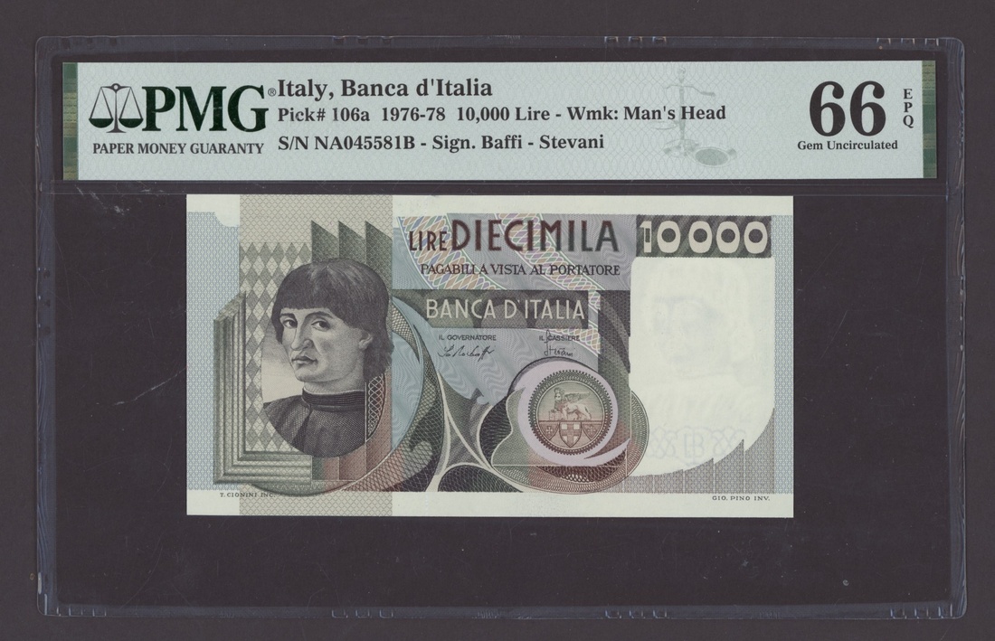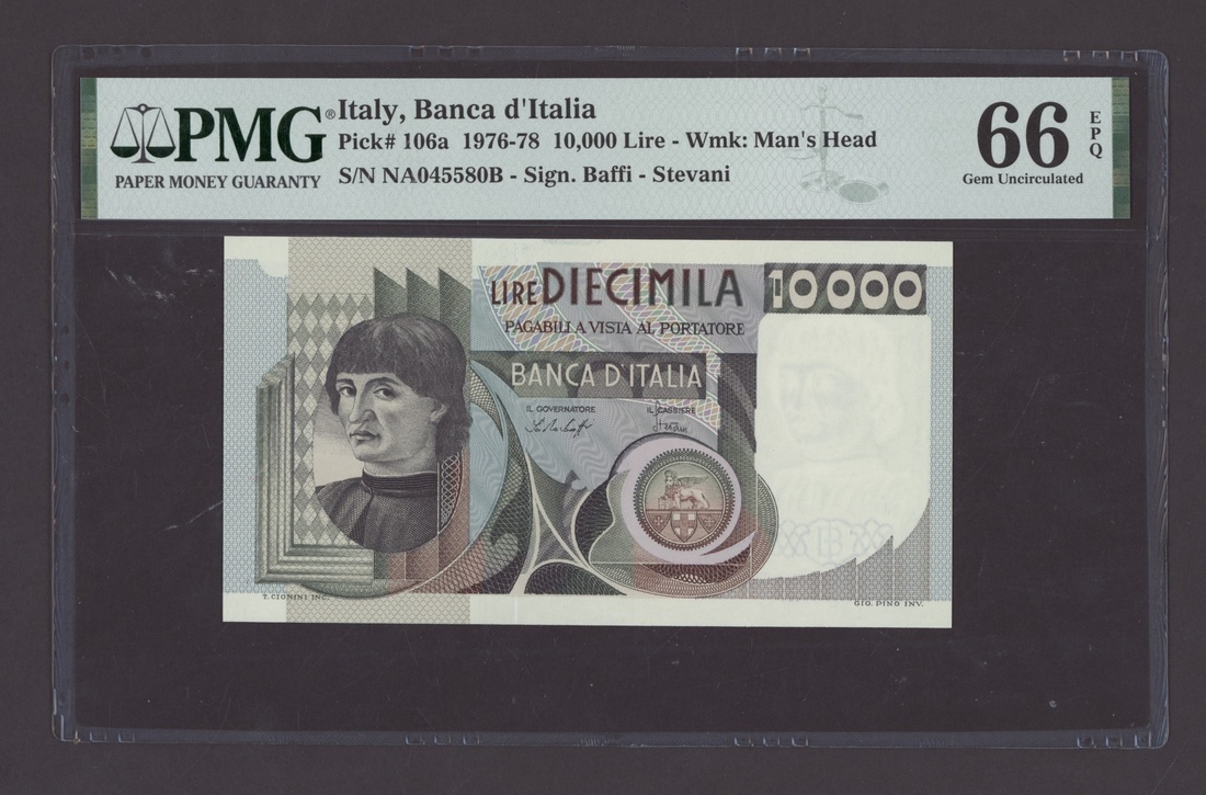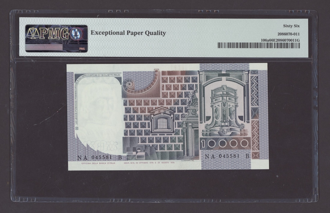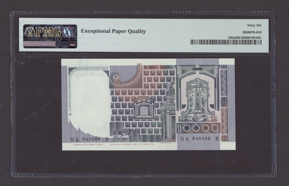 (x) Banca d'Italia, Italy, [2 notes] 10000 Lire, 1976, consecutive serial numbers NA045580B-81B, (Pick 106a), both in PMG holders 66 EPQ Gem Uncirculated (2 notes)