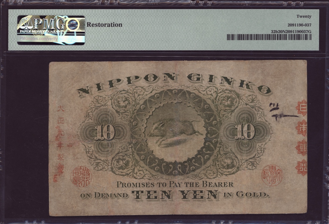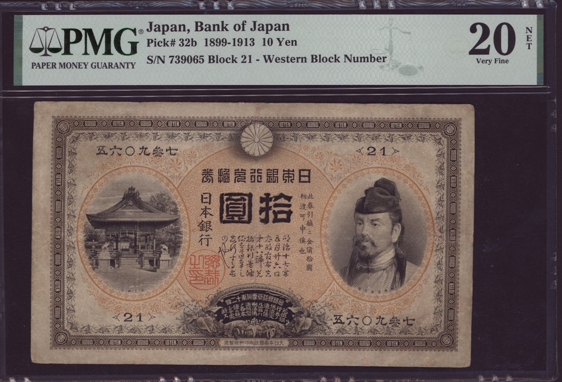 (x) Bank of Japan, 10 Yen, 1899-1913, serial number 739065, (Pick 32b), in PMG holder 20 NET Very Fine, restoration