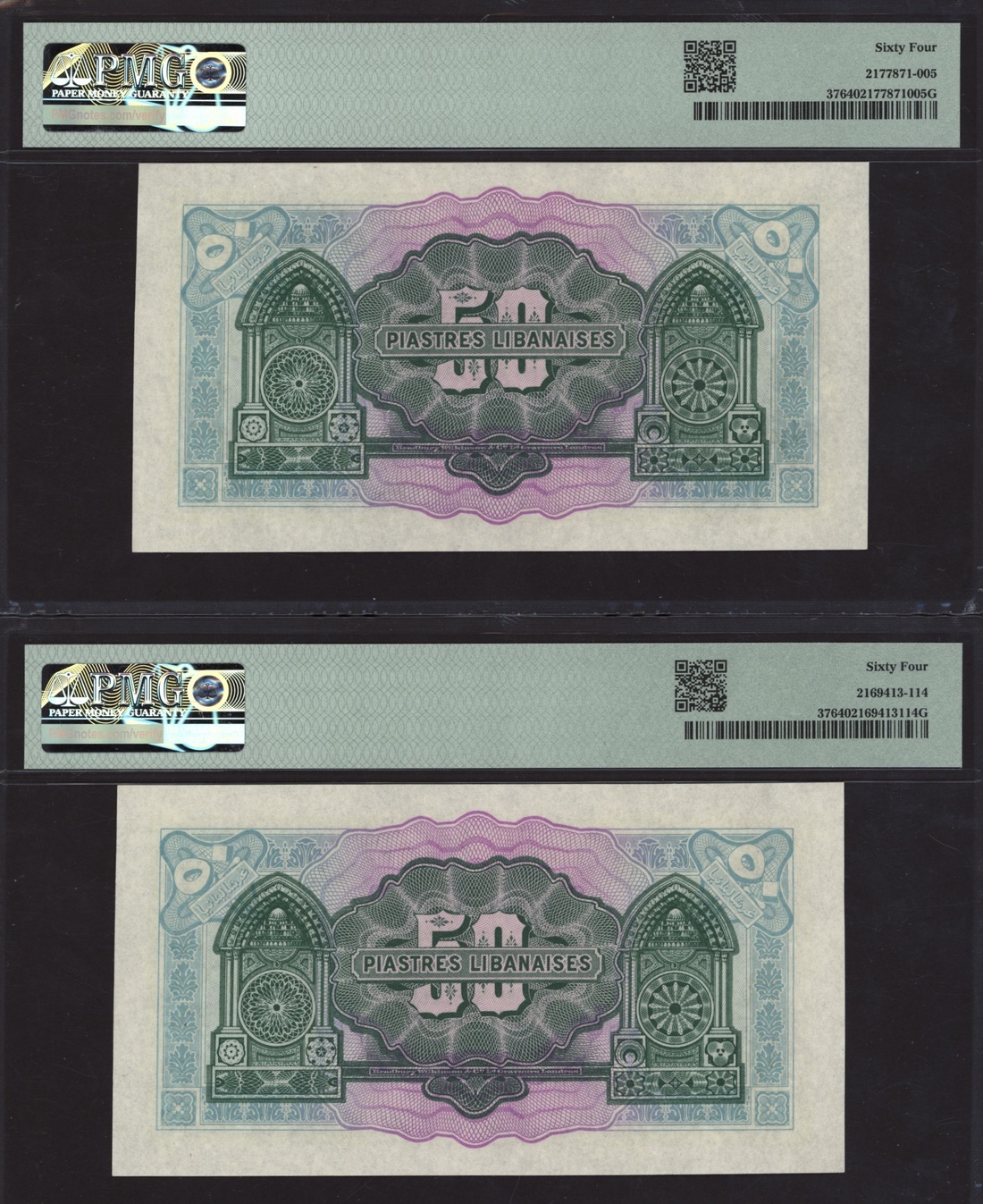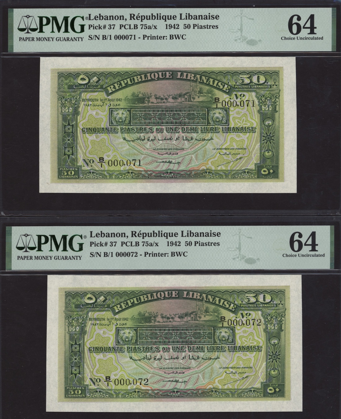 (x) Republique Libanaise, 50 Piastres, 1942, consecutive serial number B/1 000071-2, (Pick 37, PCLB 75a/x), in PMG holders 64 Choice Uncirculated, low serial number, especially difficult to find as consecutive (2 notes)