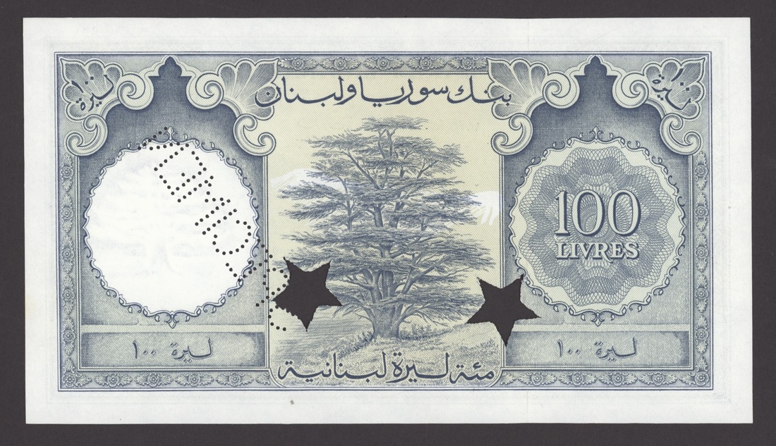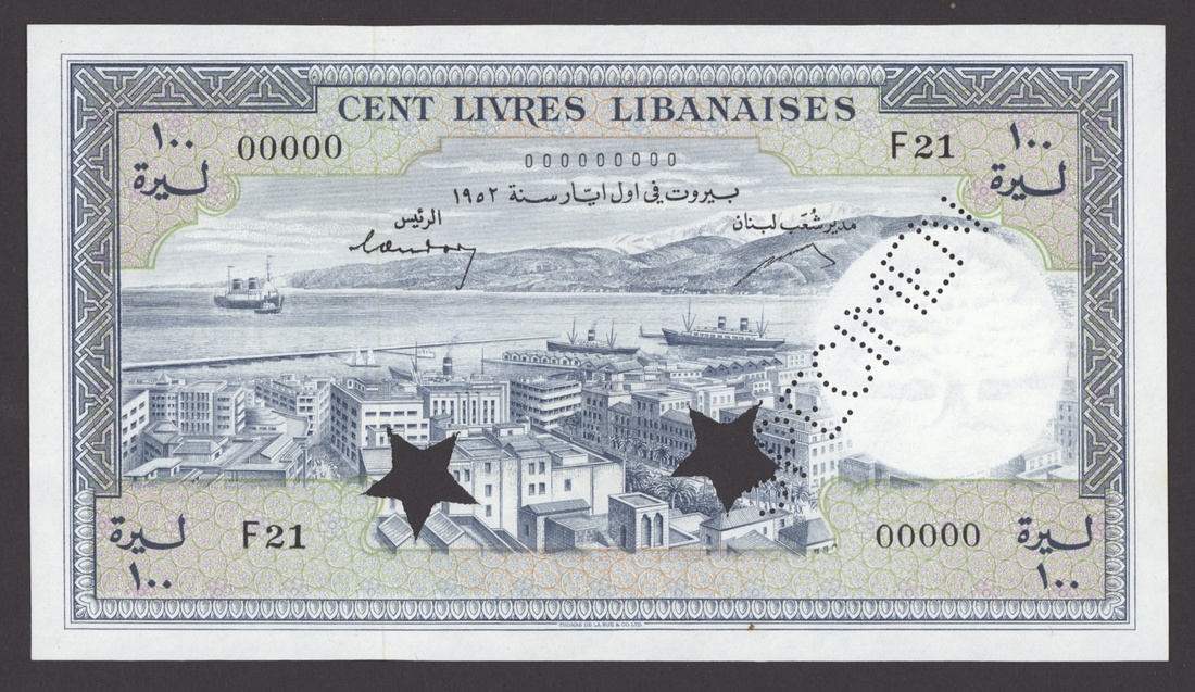 Lebanon, specimen 100 Livres, 1952-63, serial number F21 00000, (Pick 60s, BNB 229), about uncirculated, evidence of minor handling, star shaped hole punch cancellations