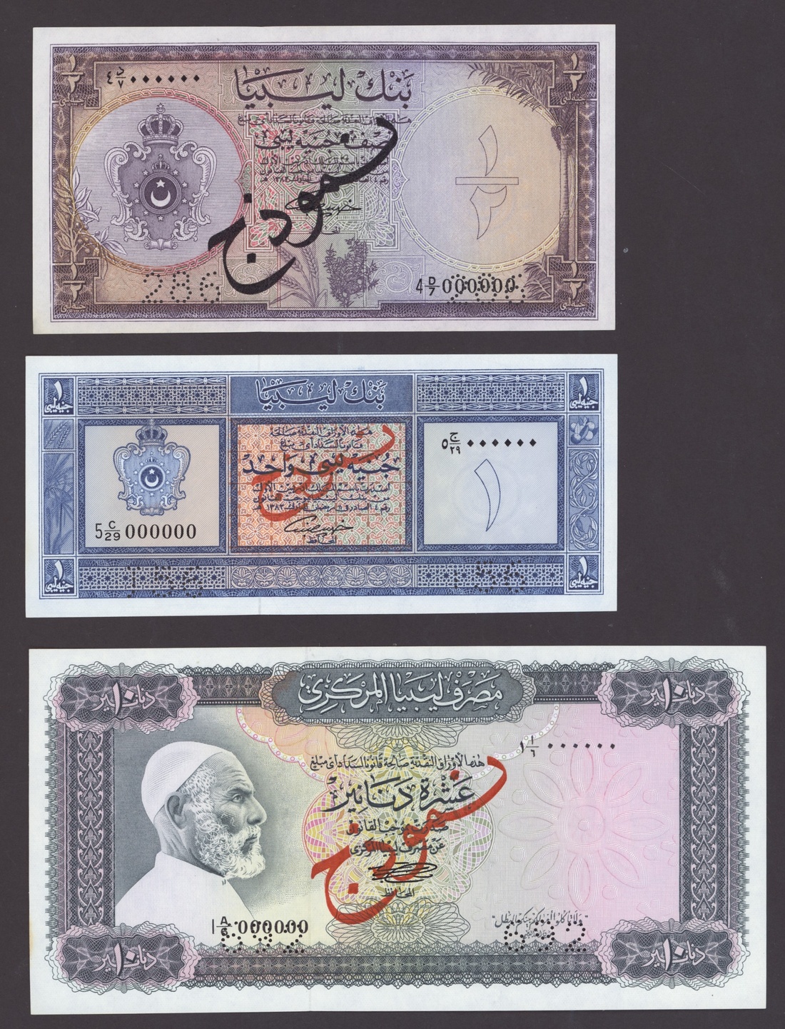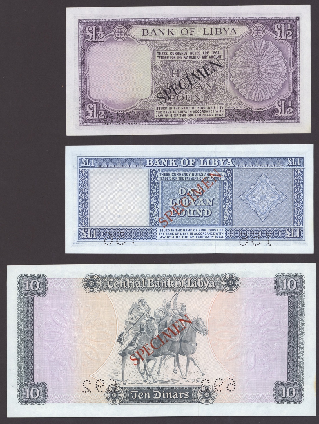 Bank of Libya, Central Bank, [3 notes] specimen 1/2, 1 Pound, 10 Dinars, 1963-72, (Pick 24as, 30as, 37bs, BNB 402as, 408as1, 505bs), uncirculated (3 notes)
