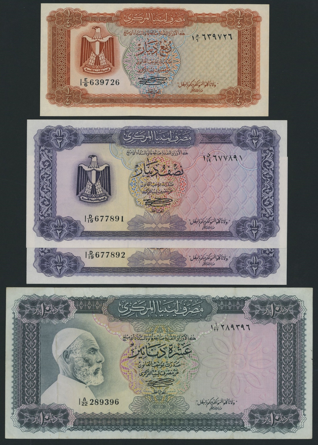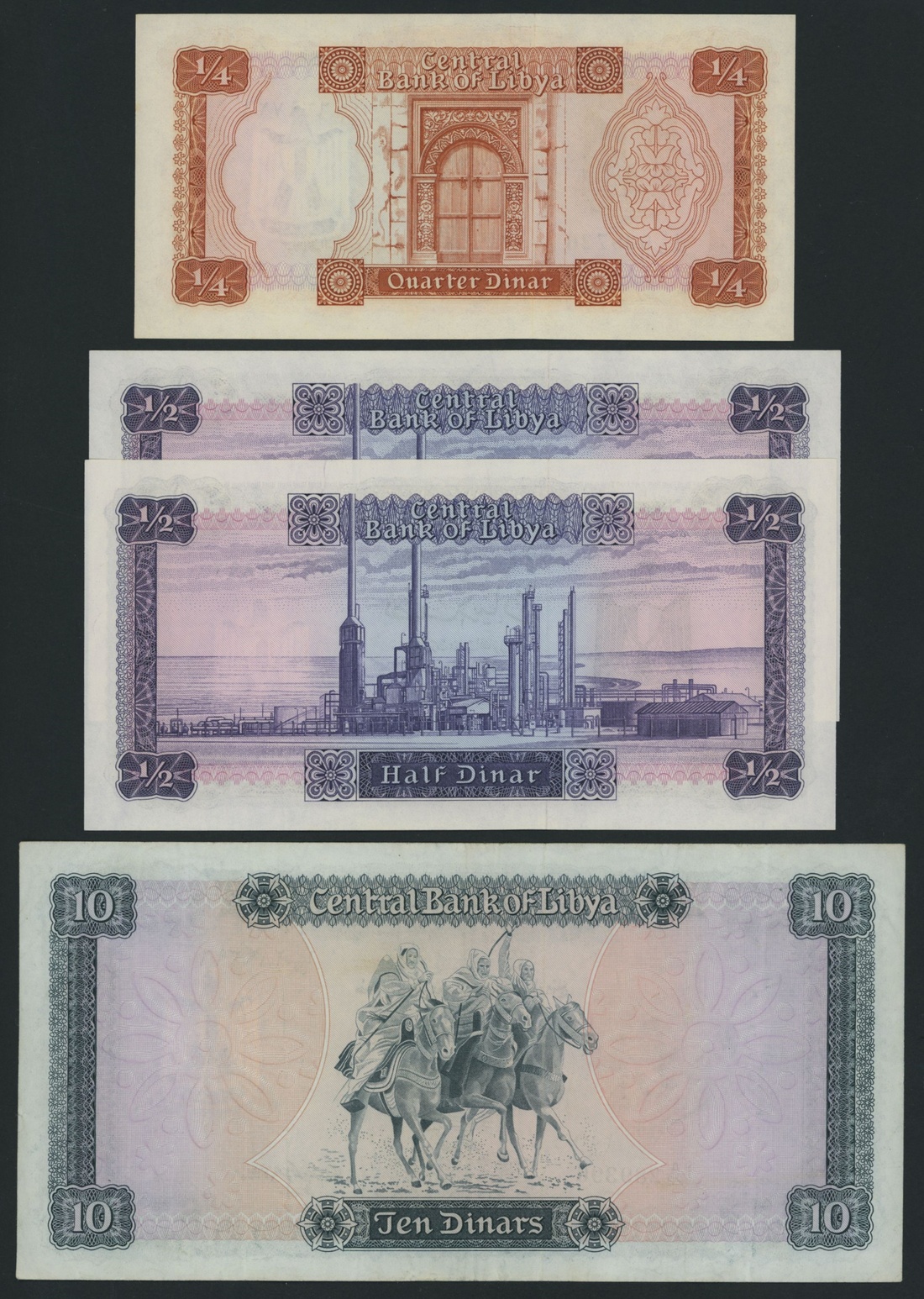 Central Bank of Libya, [4 notes] 1/4, 1/2, 10 Dinars, ND (1972),