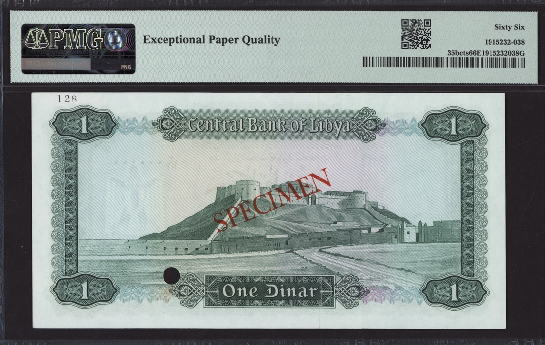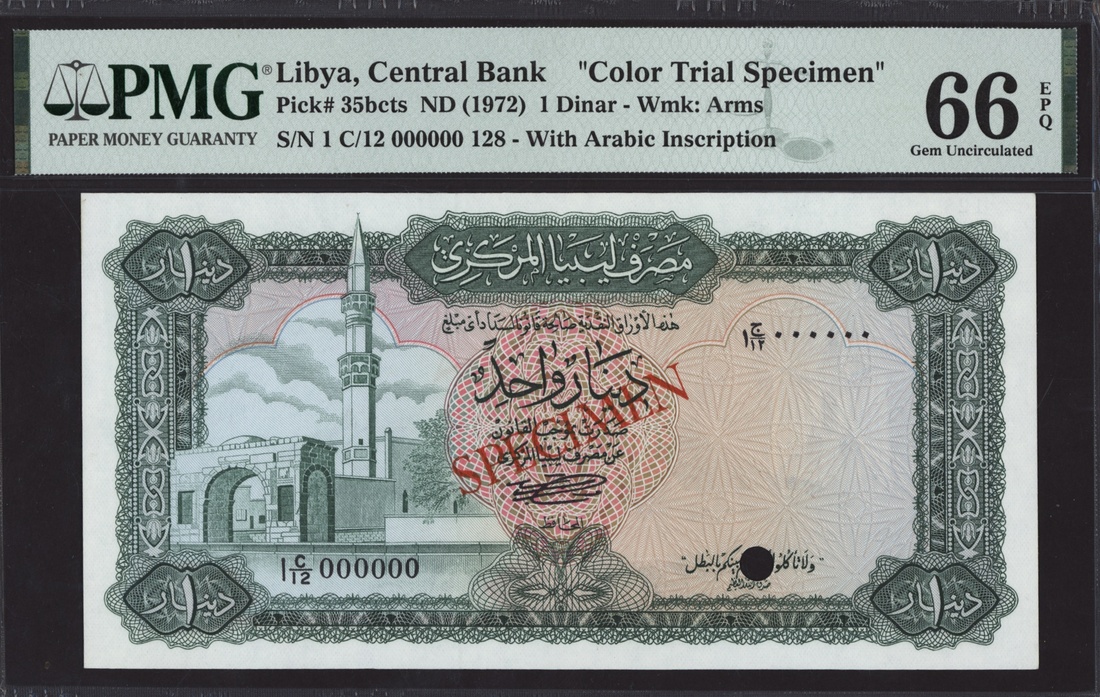 (x) Central Bank of Libya, colour trial specimen 1 Dinar, ND (1972), serial number 1 C/12 000000 128, (Pick 35bcts, BNB 503), in PMG holder 66 EPQ Gem Uncirculated