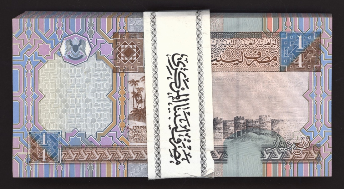 Central Bank of Libya, [100 notes] 1/4 Dinar, ND (2002), consecutive serial numbers 5 /4 641401-641500, (Pick 62, BNB B526), uncirculated, bound with Central Bank of Libya money band (100 notes)