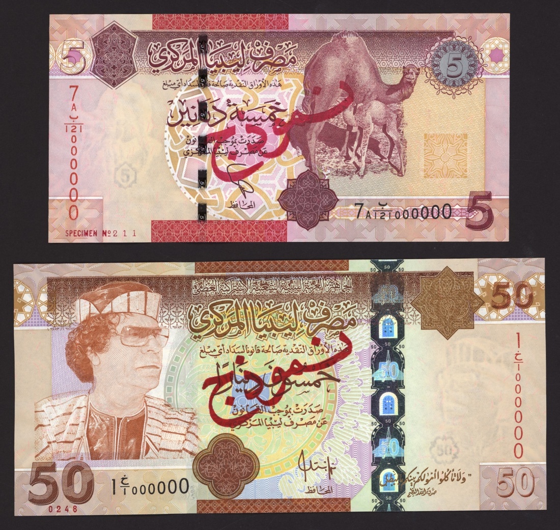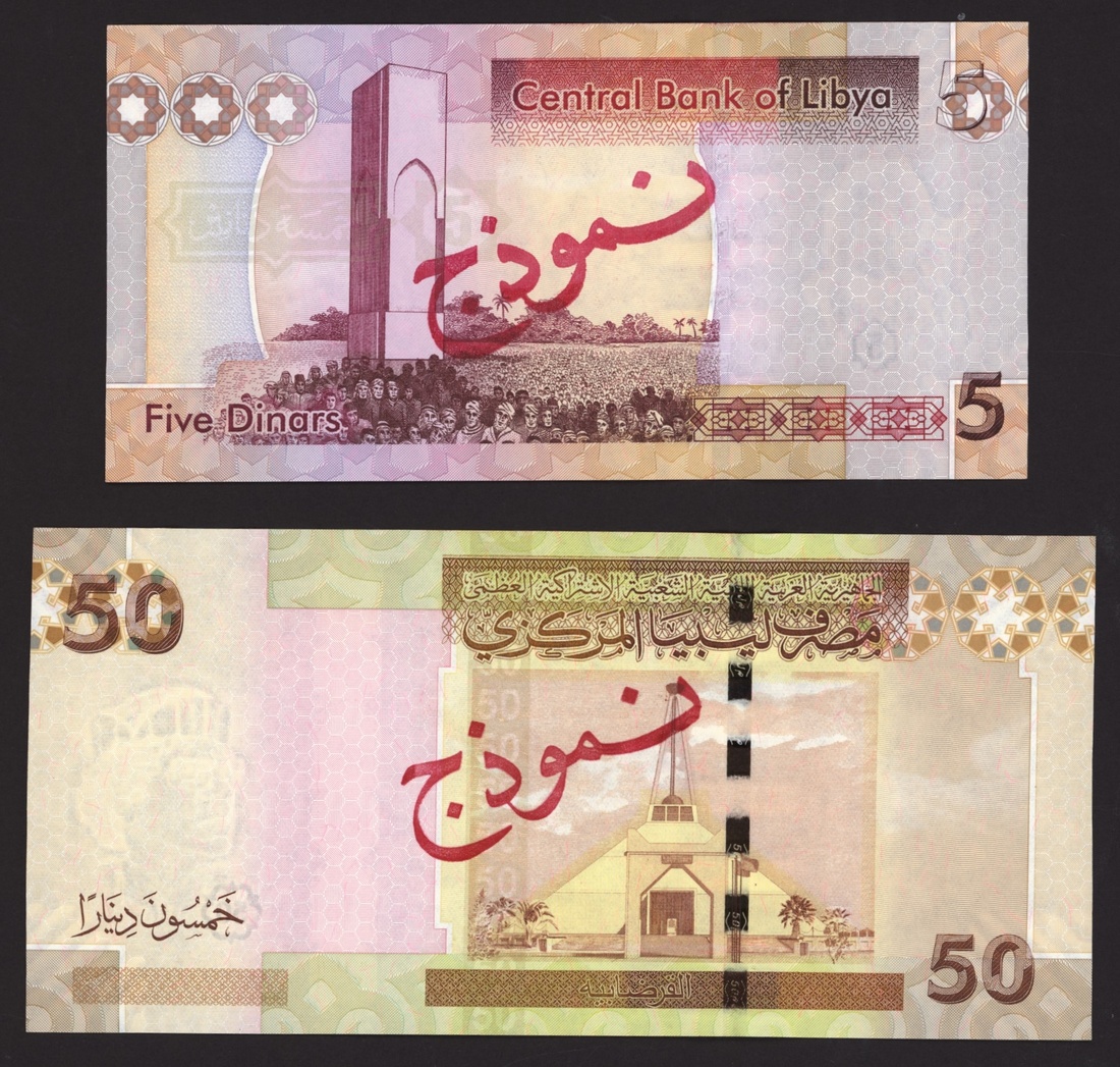 Central Bank of Libya, [2 notes] specimen 5, 50 Dinar, ND (2008-2012), serial numbers 7A B/121 000000 211, and 1 G/1 000000 0248, (Pick 75as, 77as, BNB B539as, B540as), uncirculated (2 notes)