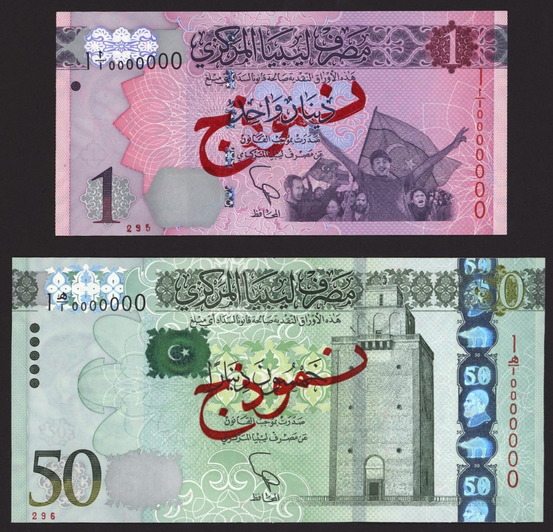 Central Bank of Libya, [2 notes] specimen 1, 50 Dinar, ND (2013), serial numbers 1 A/1 0000000 295, and 1 E/1 0000000 296, (Pick 76as, 80as, BNB B543s, B547s), uncirculated (2 notes)