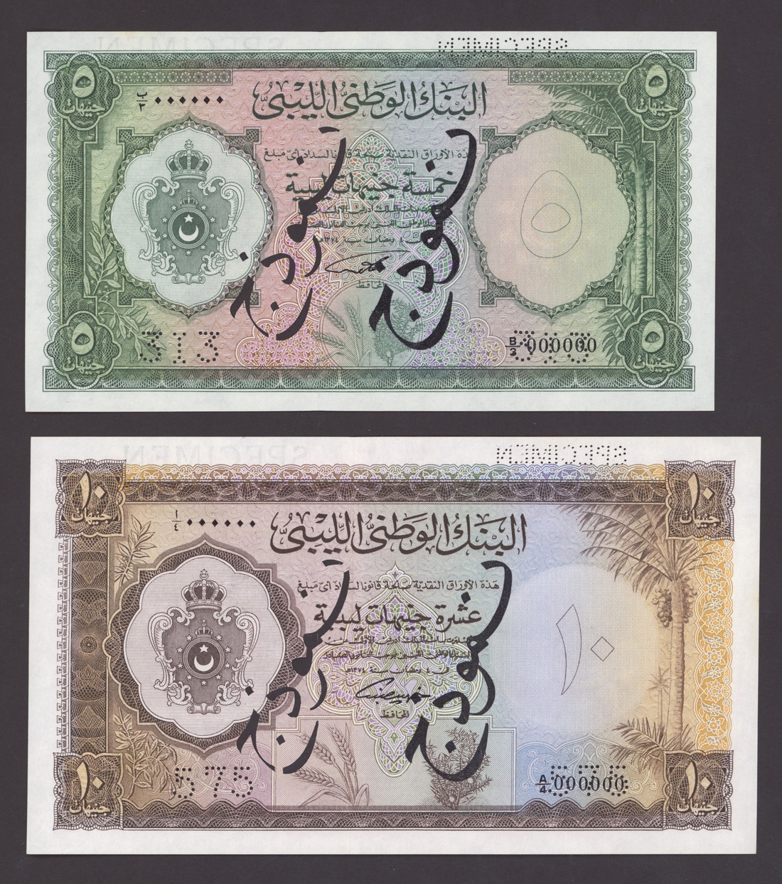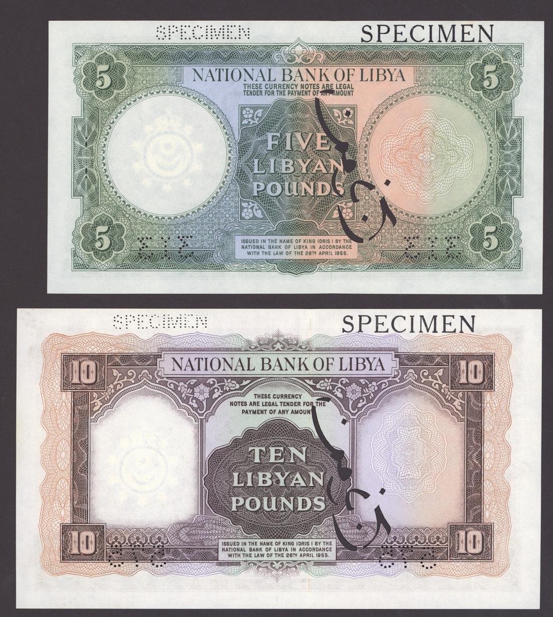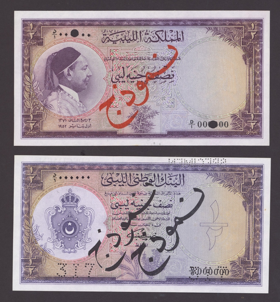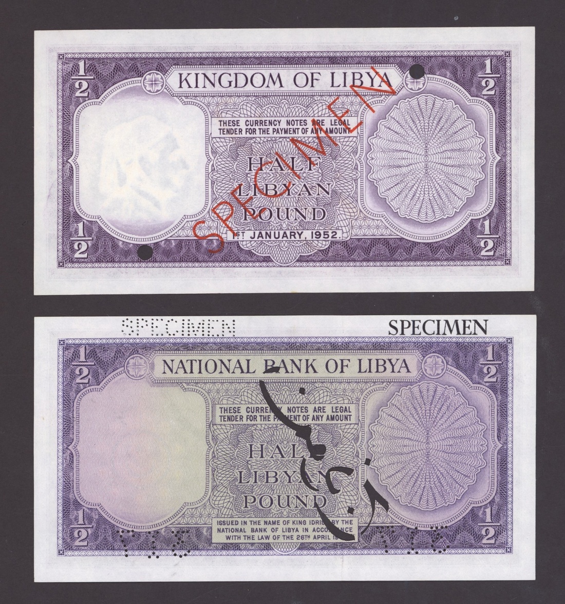 Kingdom of Libya, National Bank of Libya, [4 notes] specimens, 1/2, 5, 10 Pounds, 1952-55, 1/2 Pound, 1st January 1952, serial number D/1 000000; 1/2 Pound 26th April 1955, serial number D/6 000000, 317 perforation; 5 Pounds 26th April 1955, serial number B/3 000000, 313 perforation; 10 Pounds 26th April 1955, serial number A/4 000000, 575 perforation