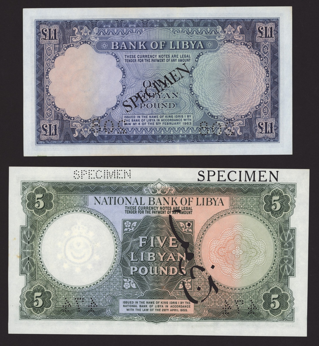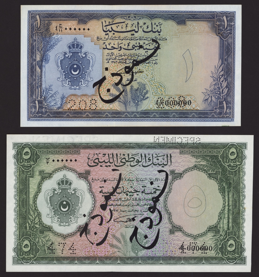 National Bank of Libya, [2 notes] specimen 1, 5 Libyan Pounds, 1955-1963, serial number 4 C/11 000000 and B/3 000000, (Pick 20s, 21s, BNB B302as2, B303as), uncirculated (2 notes)