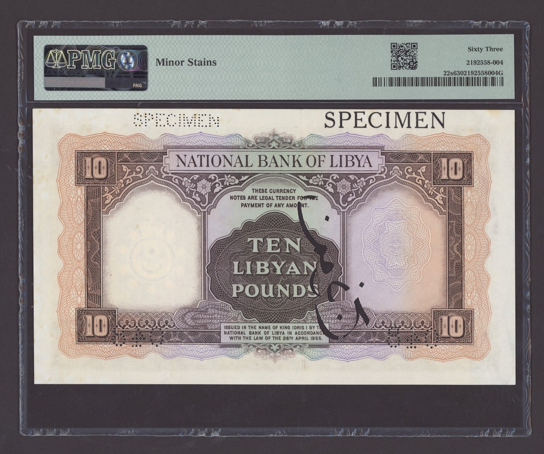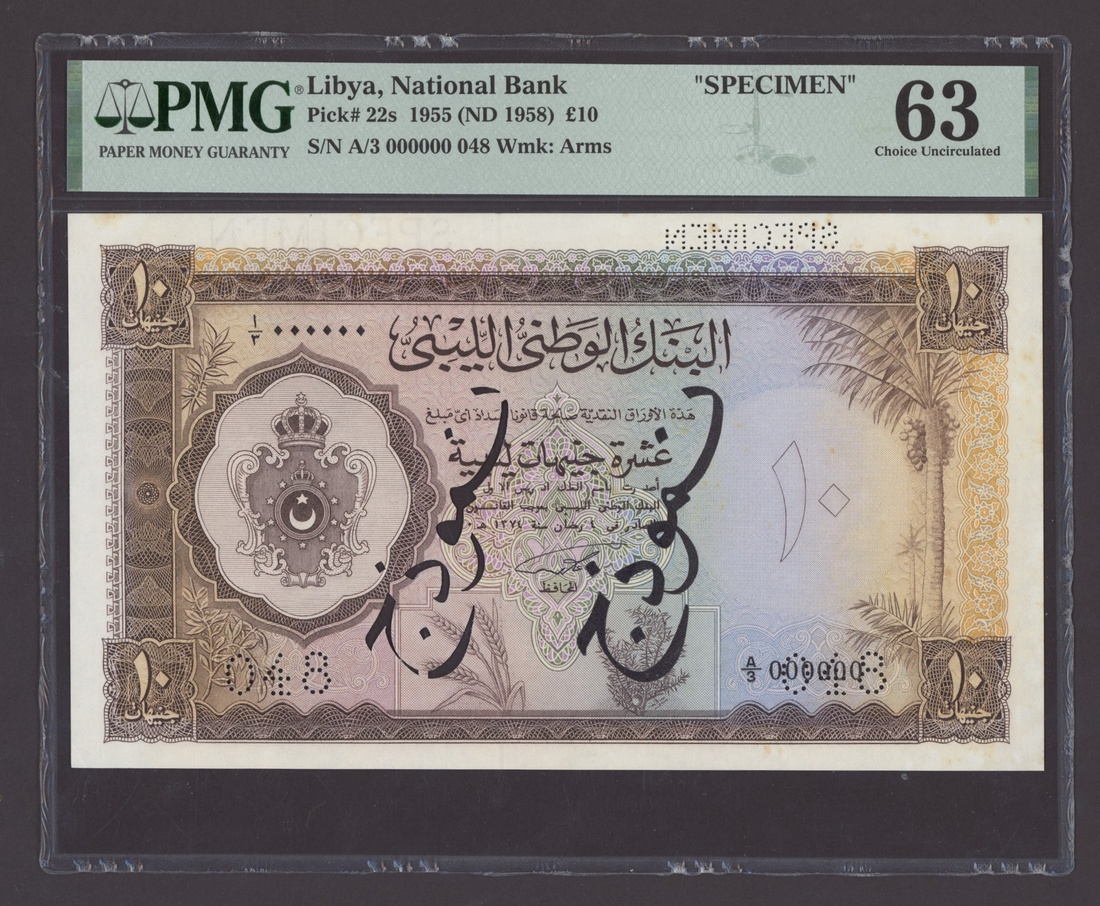 (x) National Bank of Libya, specimen £10, 1955 (ND 1958), serial number A/3 000000 048, (Pick 22s, BNB 304), in PMG holder 63 choice Uncirculated, minor stains