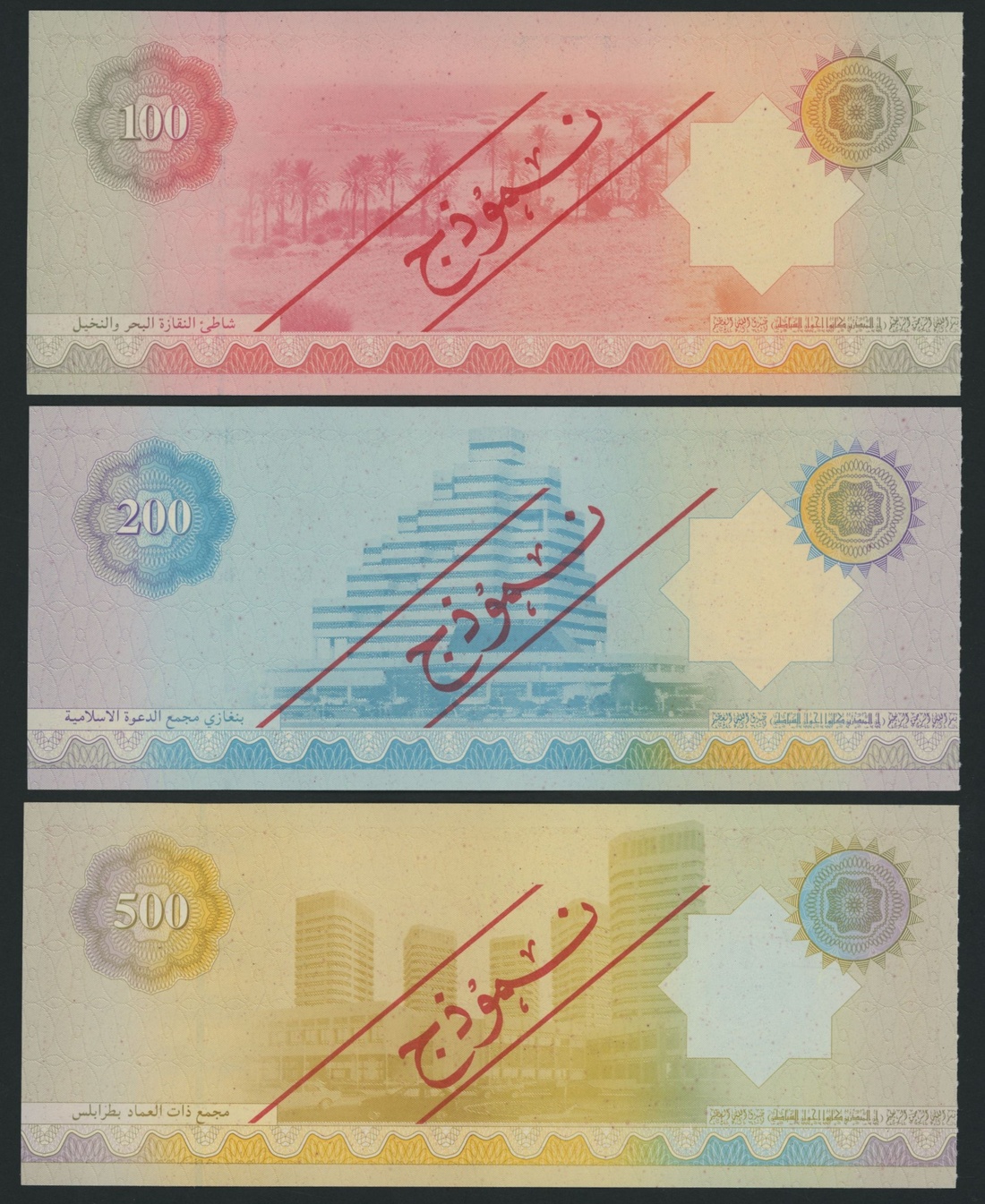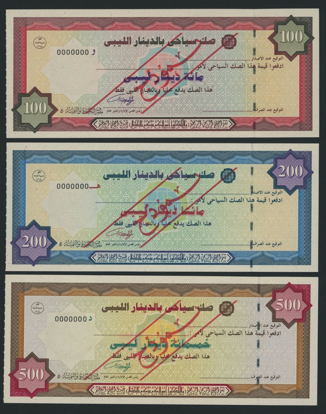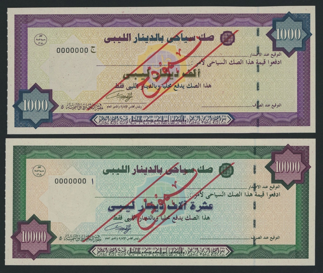 Libya specimen cheques, [5 notes] specimen 100, 200, 500, 1000, 10000 Dinar cheques, (Pick unlisted), uncirculated (5 notes)