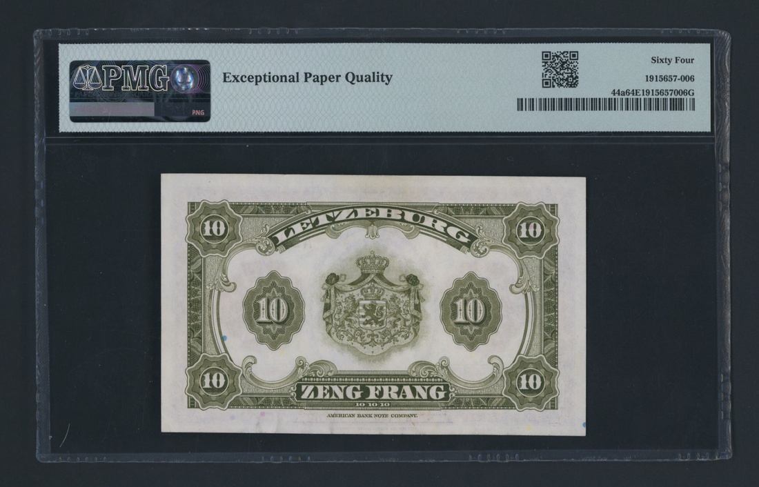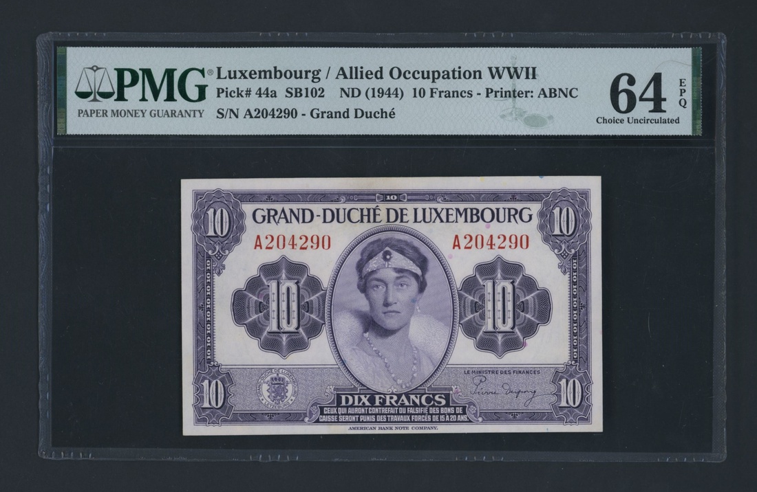 (x) Grande-Duche de Luxembourg, Allied Occupation WWII, 10 Francs, ND (1944), serial number A204290, (Pick 44a), in PMG holder 64 EPQ Choice Uncirculated