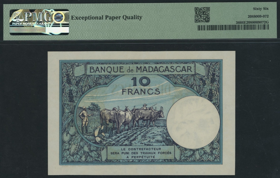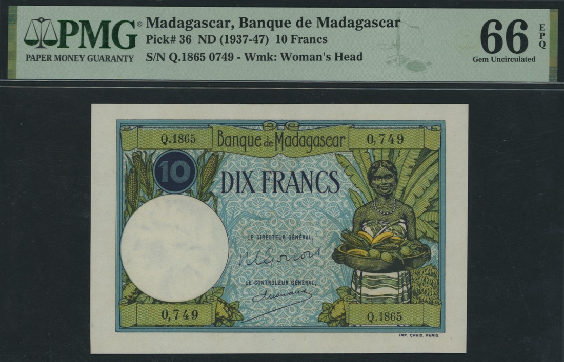(x) Banque de Madagascar, 10 Francs, ND (1937-47), serial number Q.1865 0749, (Pick 36, BNB 203), in PMG holder 66 EPQ Gem Uncirculated