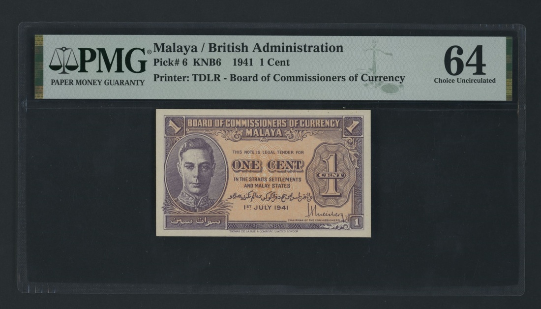 Board of Commissioners of Currency, Malaya, 1 Cent, 1st July 1941, (Pick 6, BNB 107), in PMG holder 64 Choice Uncirculated