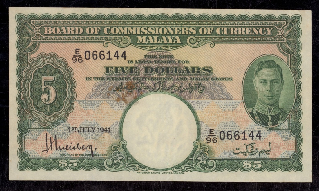 (x) Commissioners of Currency, Malaya, $5, 1st July 1941, serial number E/96 066144, (Pick 12, BNB 113), good very good, foxing
