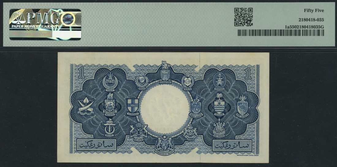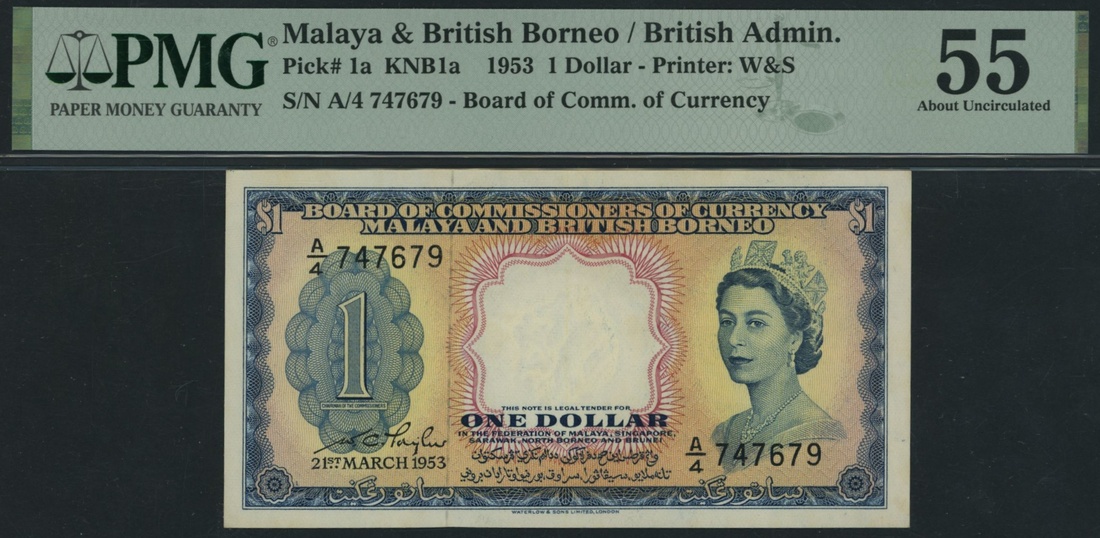 (x) Board of Commissioners of Currency, Malaya & British Borneo, 1 Dollar, 21st March 1953, serial number A/4 747679, (Pick 1a, KNB1a, BNB 101), in PMG holder 55 About Uncirculated