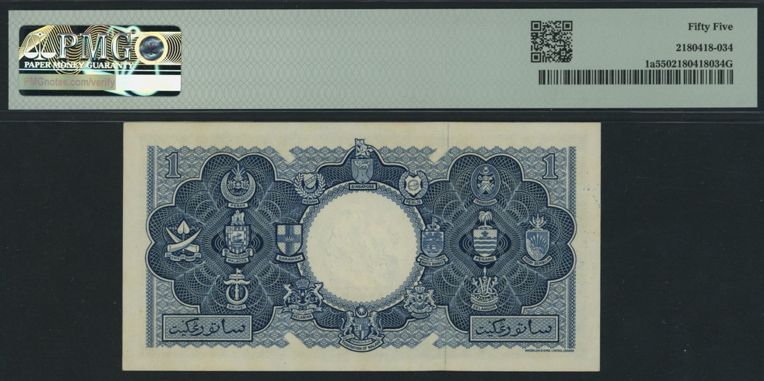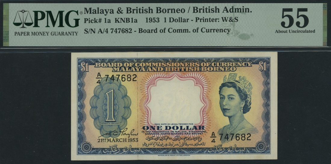 (x) Board of Commissioners of Currency, Malaya & British Borneo, 1 Dollar, 21st March 1953, serial number A/4 747682, (Pick 1a, KNB1a, BNB 101), in PMG holder 55 About Uncirculated