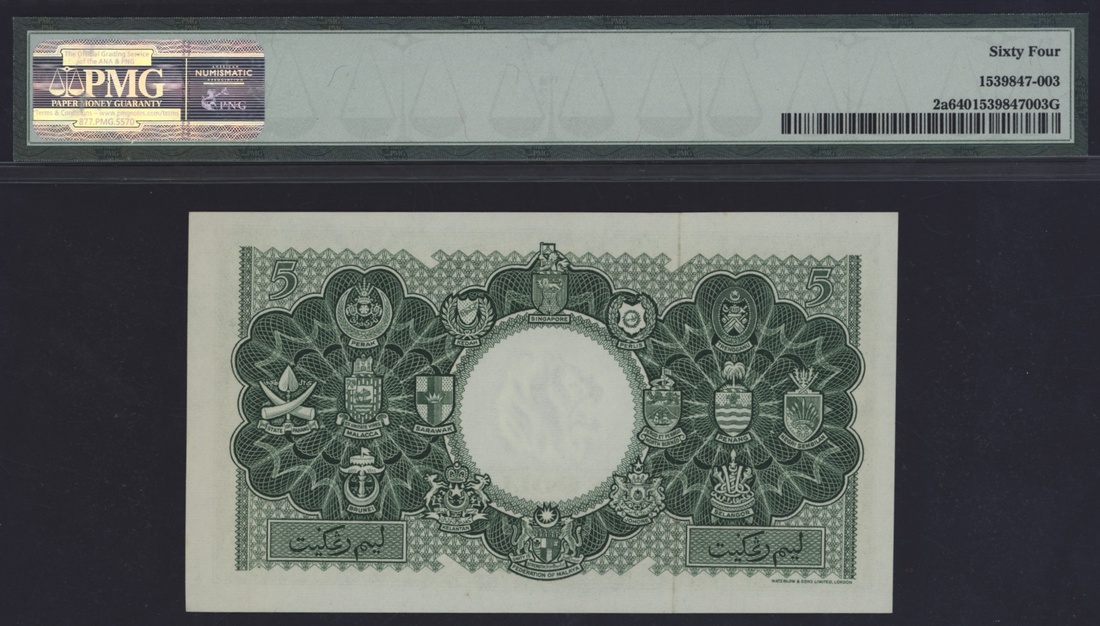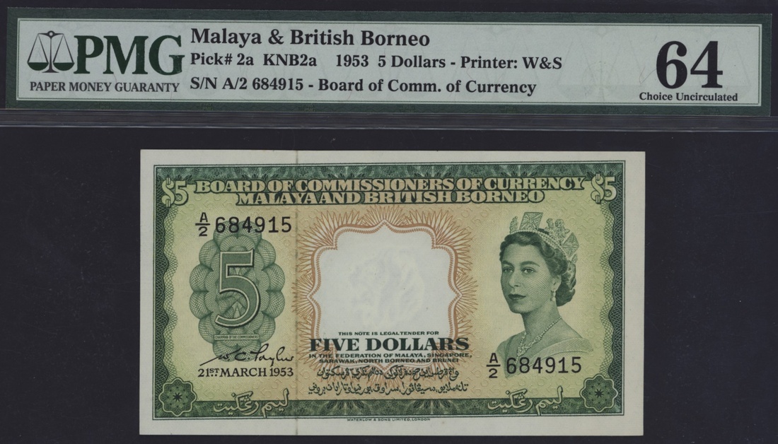 (x) Malaya and British Borneo, 5 Dollars, 21st March 1953, serial number A/2 684915, (Pick 2a), in PMG holder 64 Choice Uncirculated