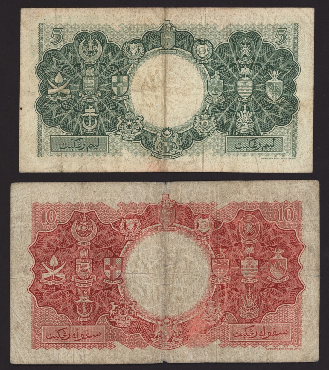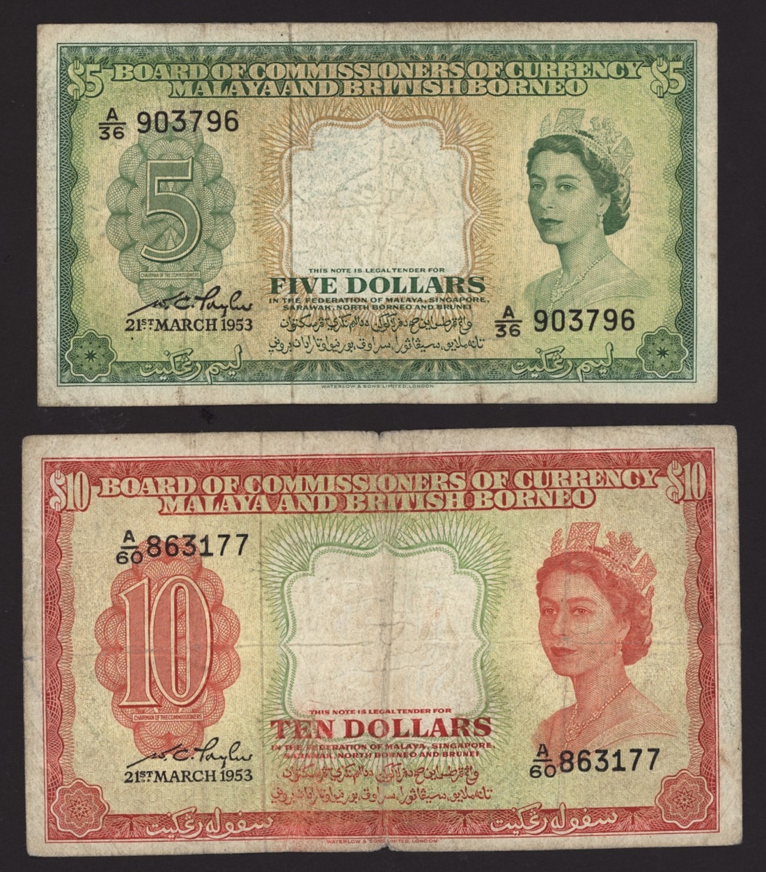 Board of Commissioners of Currency, Malaya & British Borneo, [2 notes] $5, $10, 21st March 1953, serial numbers A/36 903796 and A/60 863177, (Pick 2a, 3a, BNB 102a, 103a), fine to solid fine, discolouration on $5 notes and some tears to the margins of $10 note (2 notes)