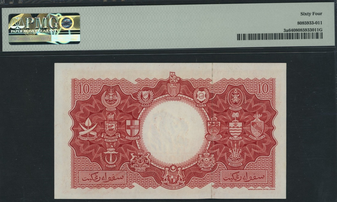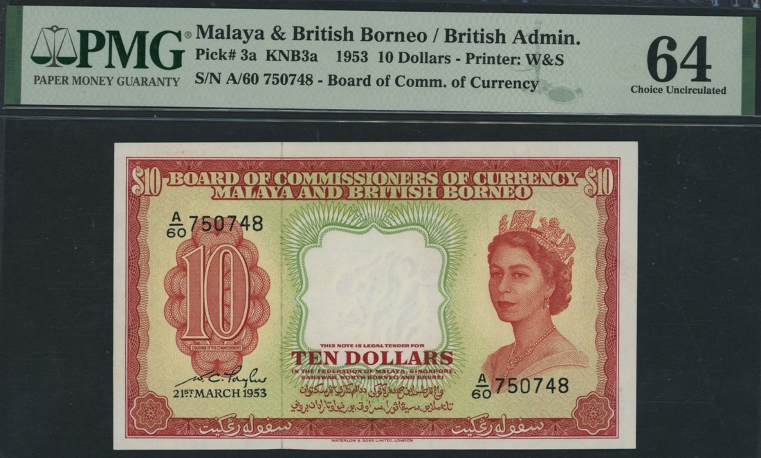 (x) Board of Commissioners of Currency, Malaya & British Borneo, 10 Dollars, 21st March 1953, serial number A/60 750748, (Pick 3a, KNB3a, BNB 103a), in PMG holder 64 Choice Uncirculated