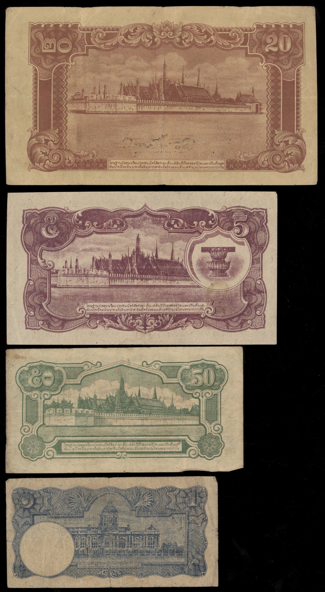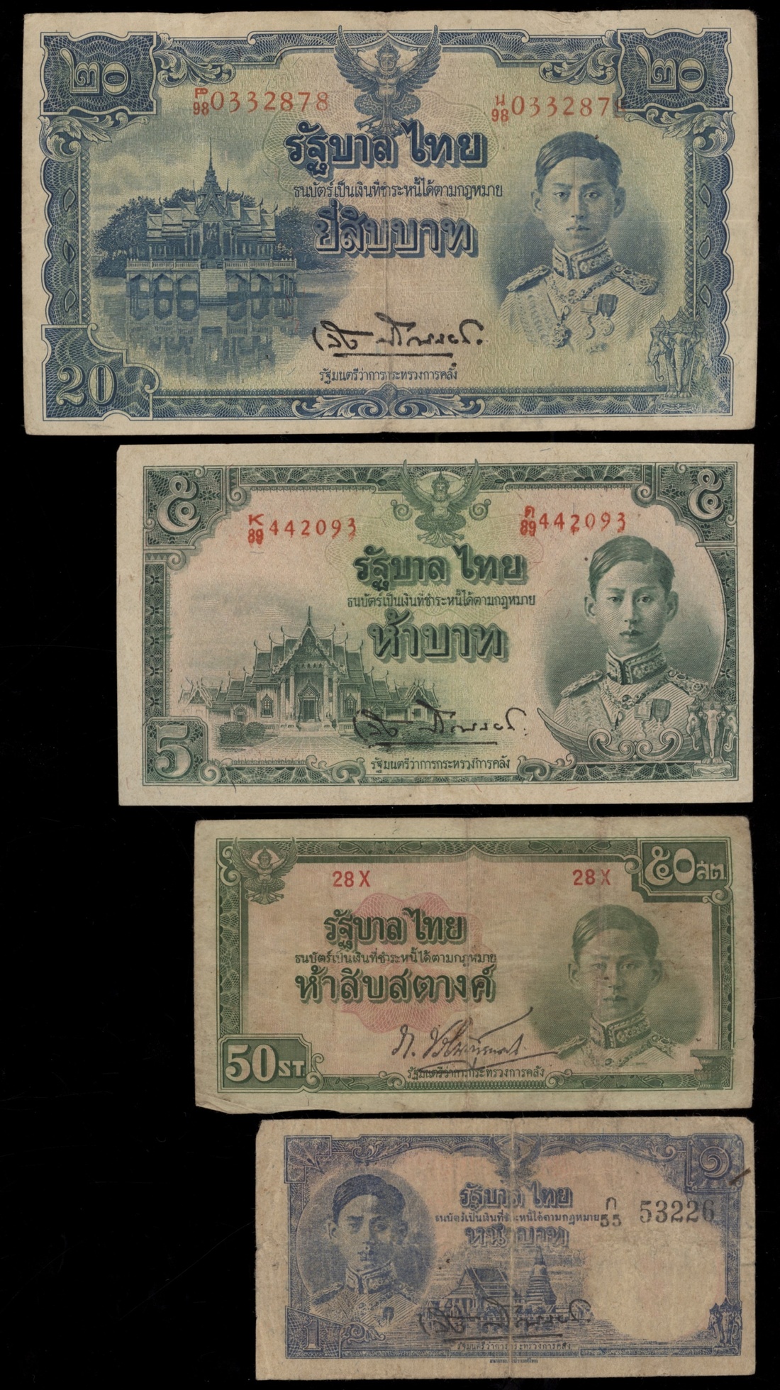 Government of Thailand (4), 1942-5: 50 Satang, serial number 28X; 5 Baht, serial number K/89 442093; 20 Baht, serial number P/98 0332878; 1 Baht, serial number A/55 53226