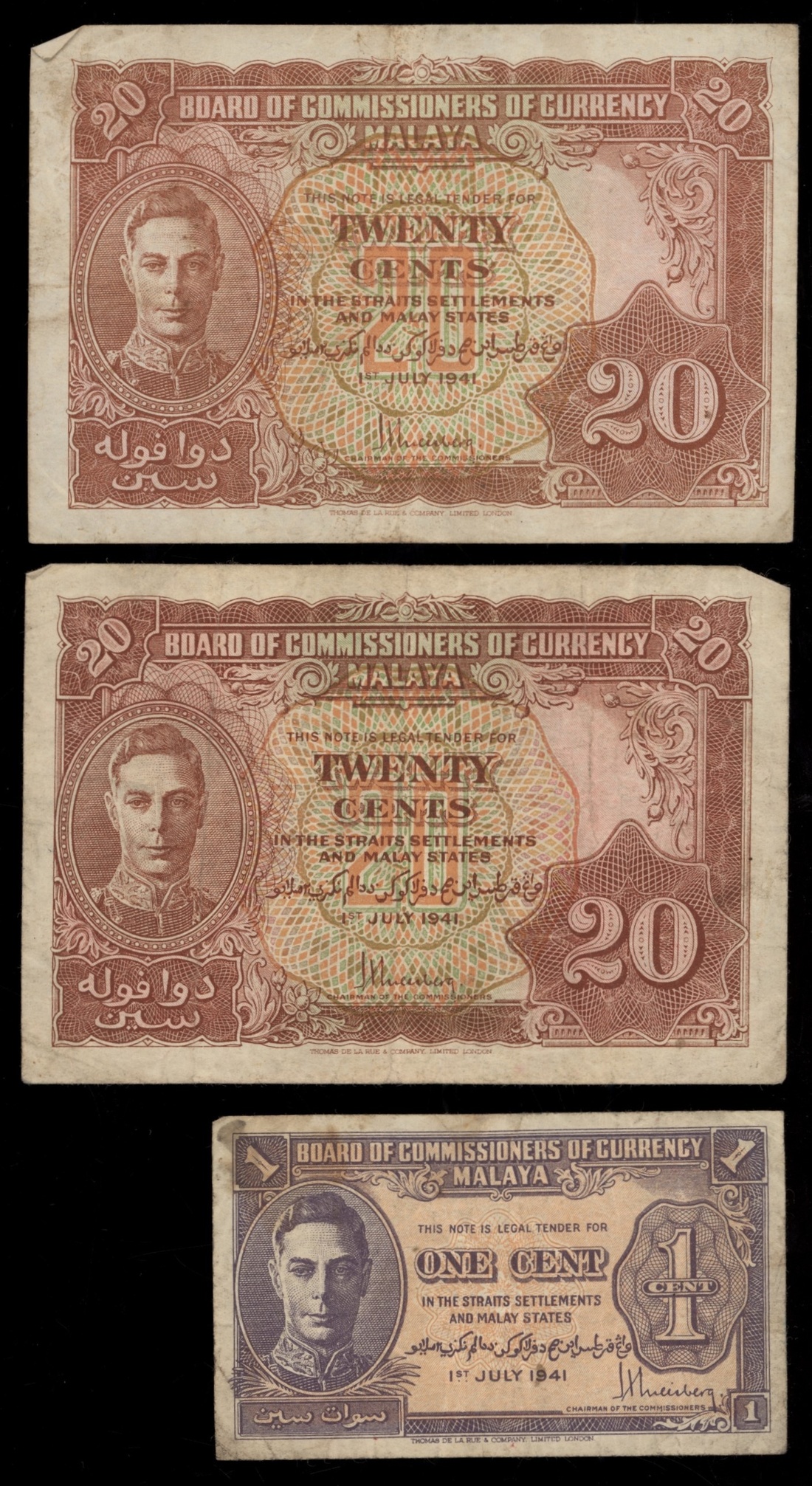 Board of Commissioners of Malaya (5): 1, 10, 20 Cents, $1, 1st July 1941, $1 serial number: G/79 013416;
