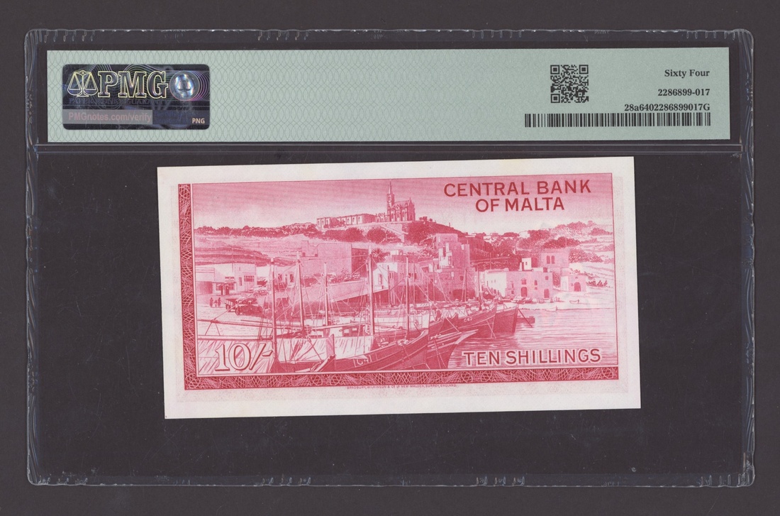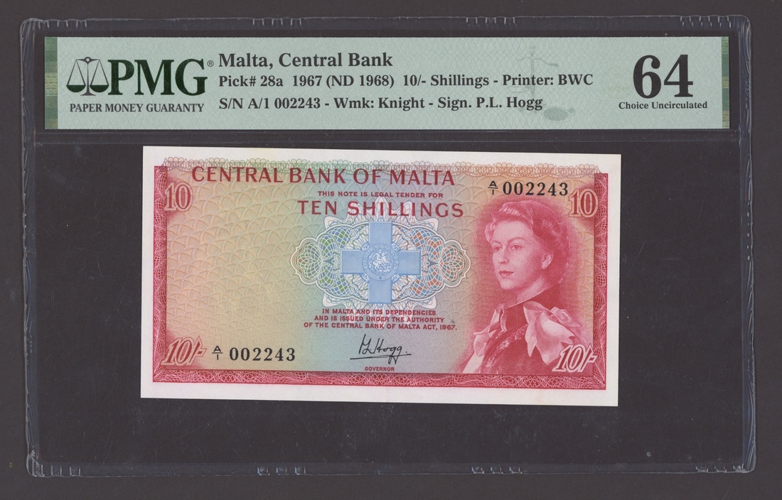 (x) Central Bank of Malta, 10 Shillings, 1967 (ND 1968), serial number A/1 002243 (Pick 28a, BNB 201), in PMG holder 64 EPQ Choice Uncirculated