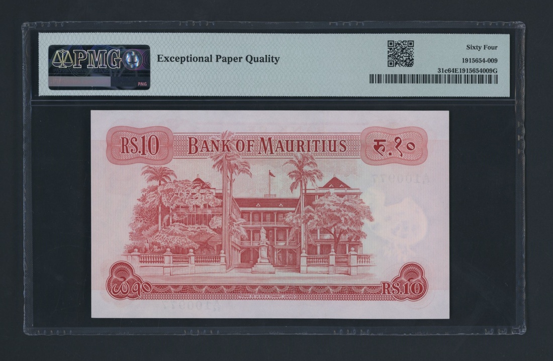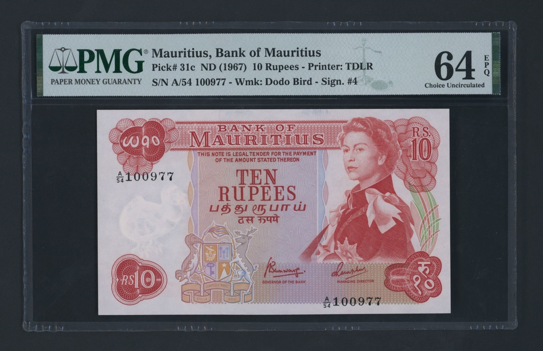 (x) Bank of Mauritius, 10 Rupees, ND (1967), serial number A/54 100977, (Pick 31c), in PMG holder 64 EPQ Choice Uncirculated
