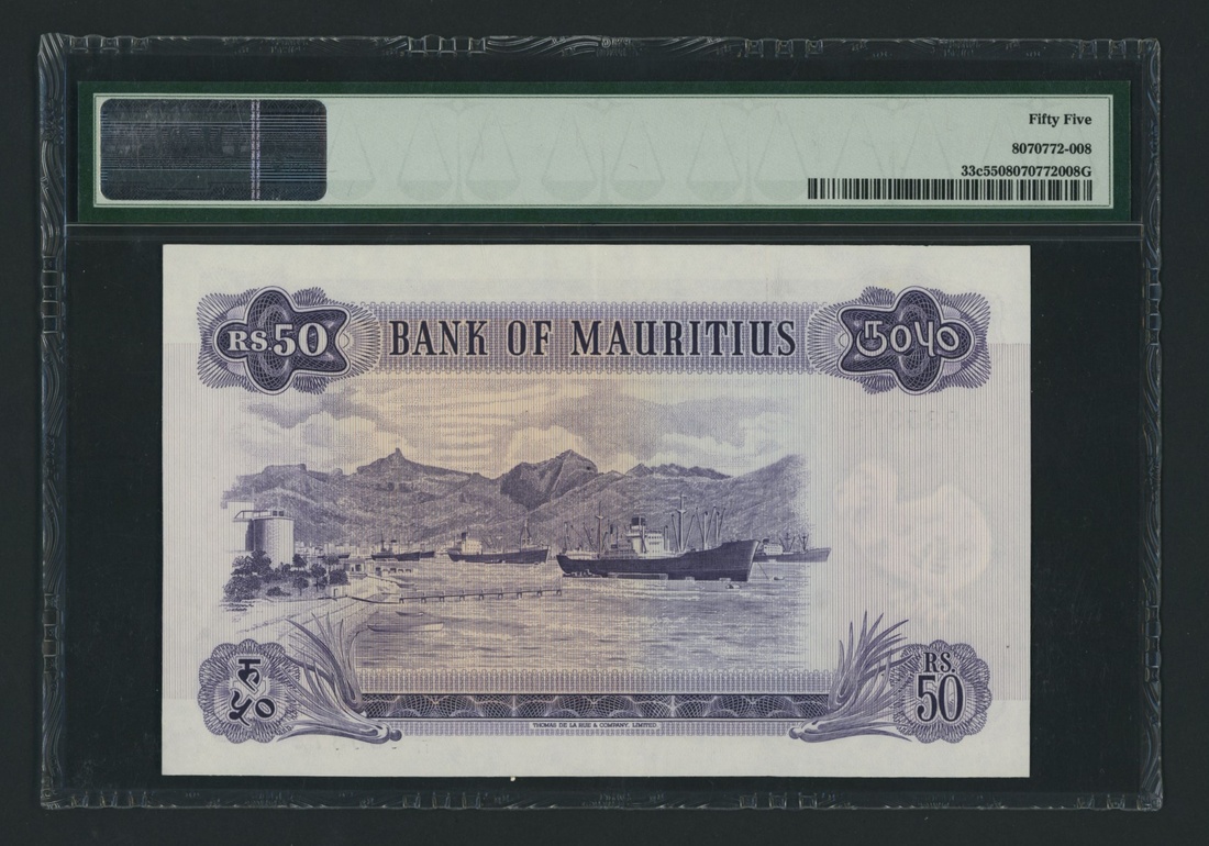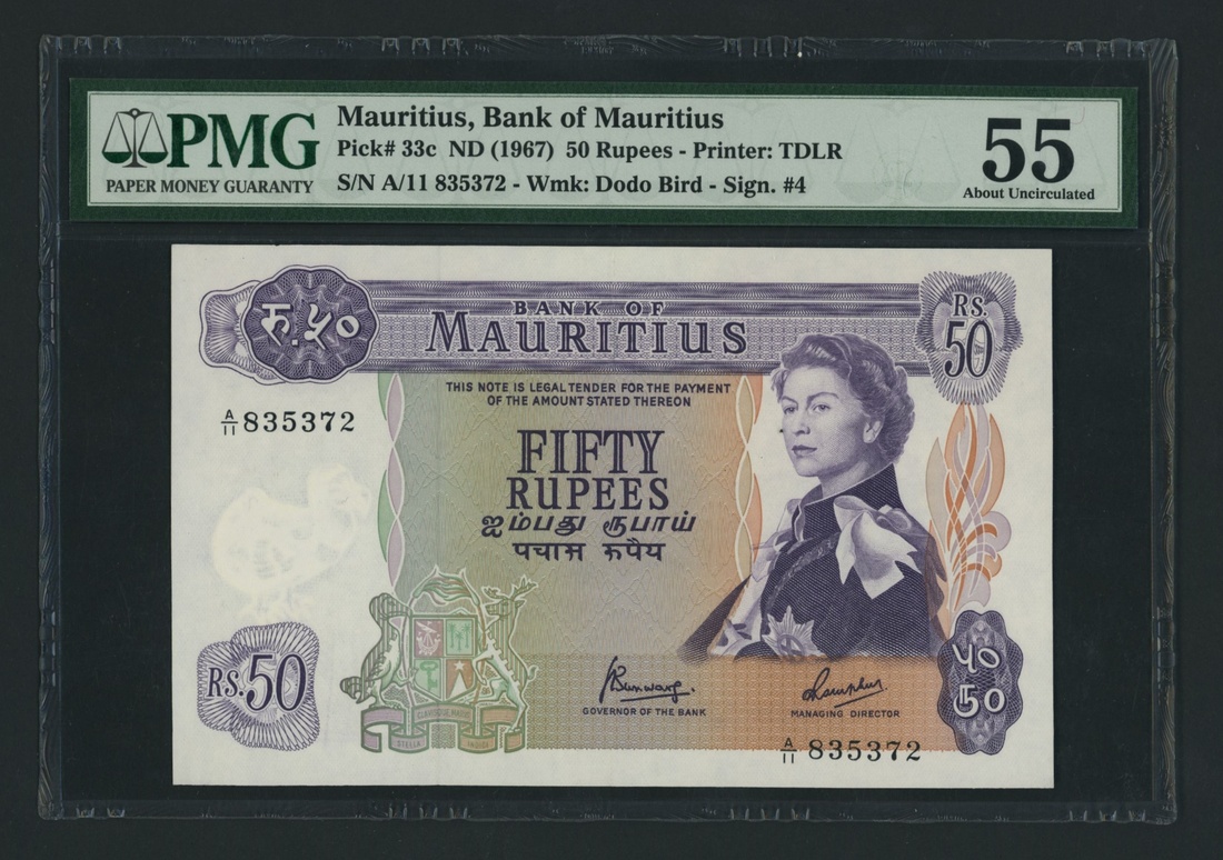 (x) Bank of Mauritius, 50 Rupees, ND (1967), serial number A/11 835372, (Pick 33c, BNB 404c), in PMG holder 55 About Uncirculated