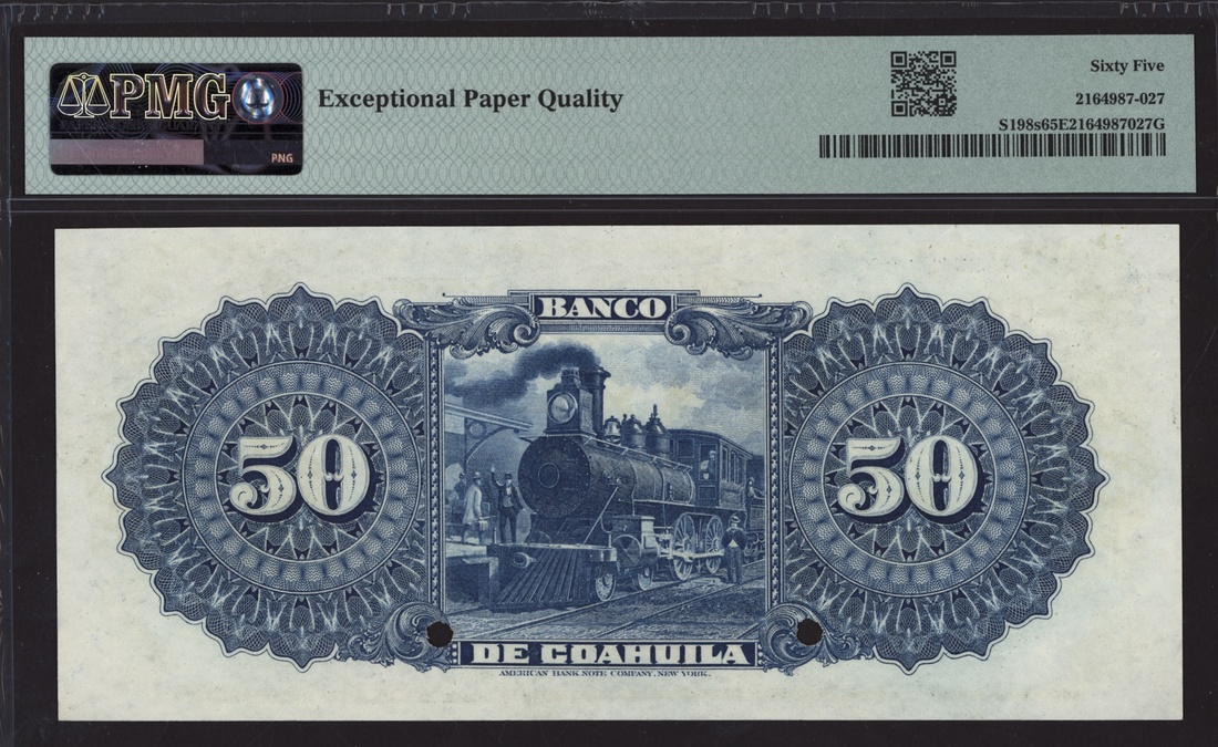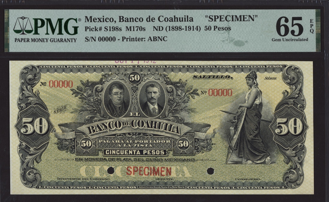 specimen 50 Pesos, Saltillo, ND (1912), serial number 00000, purple date hand stamp visible on the upper margin,