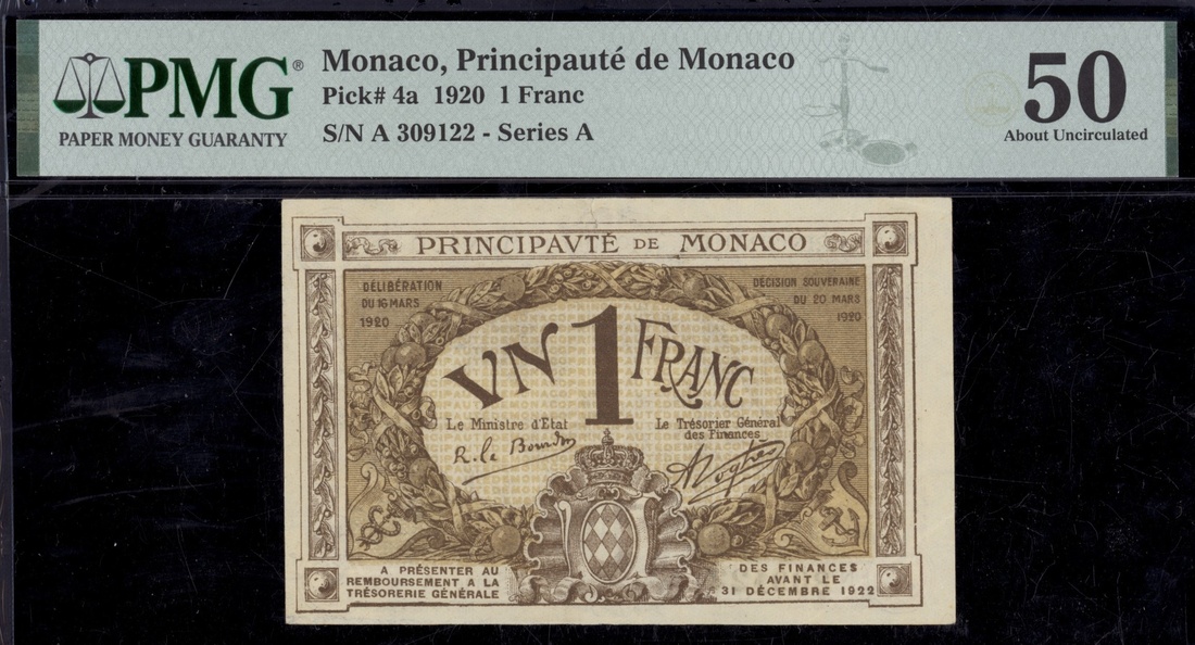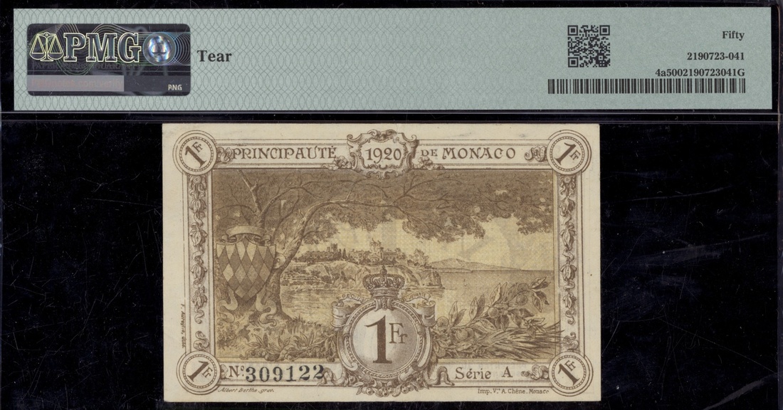 Principaute de Monaco, 1 Franc, 20th March 1920, series A, serial number 309122, (Pick 4, BNB 103), in PMG holder 50 About Uncirculated, tear