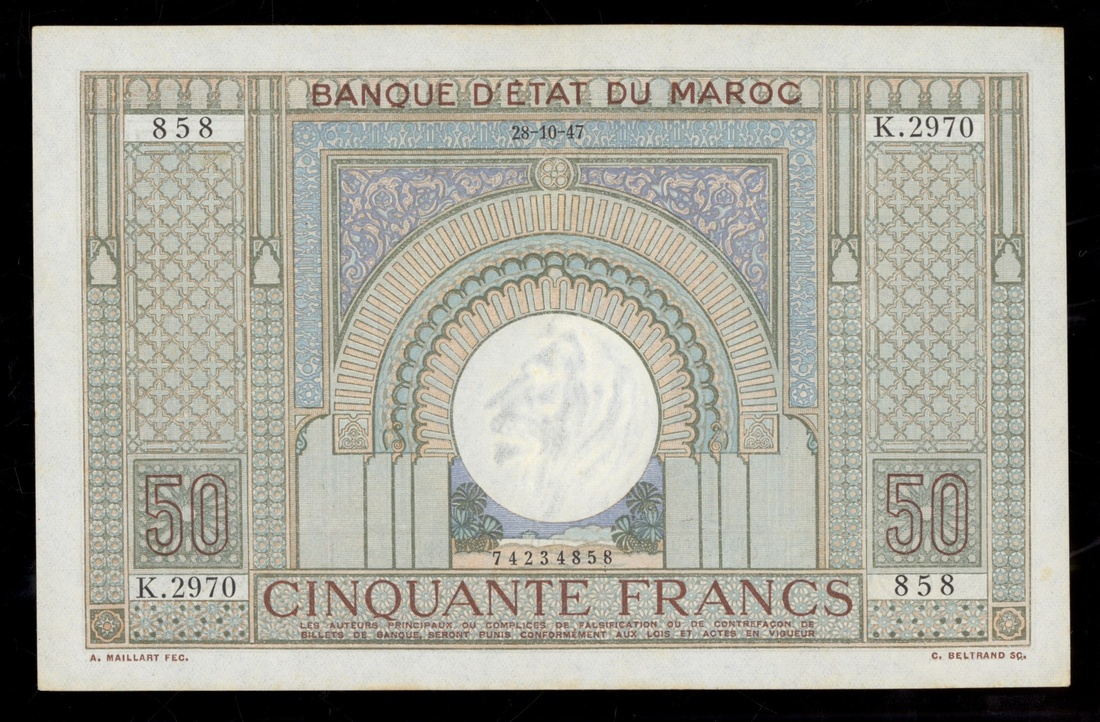Banque d´État du Maroc, Morocco, 50 Francs, 28th October 1947, serial number K.2970 858, (Pick 21, BNB 212d), extremely fine